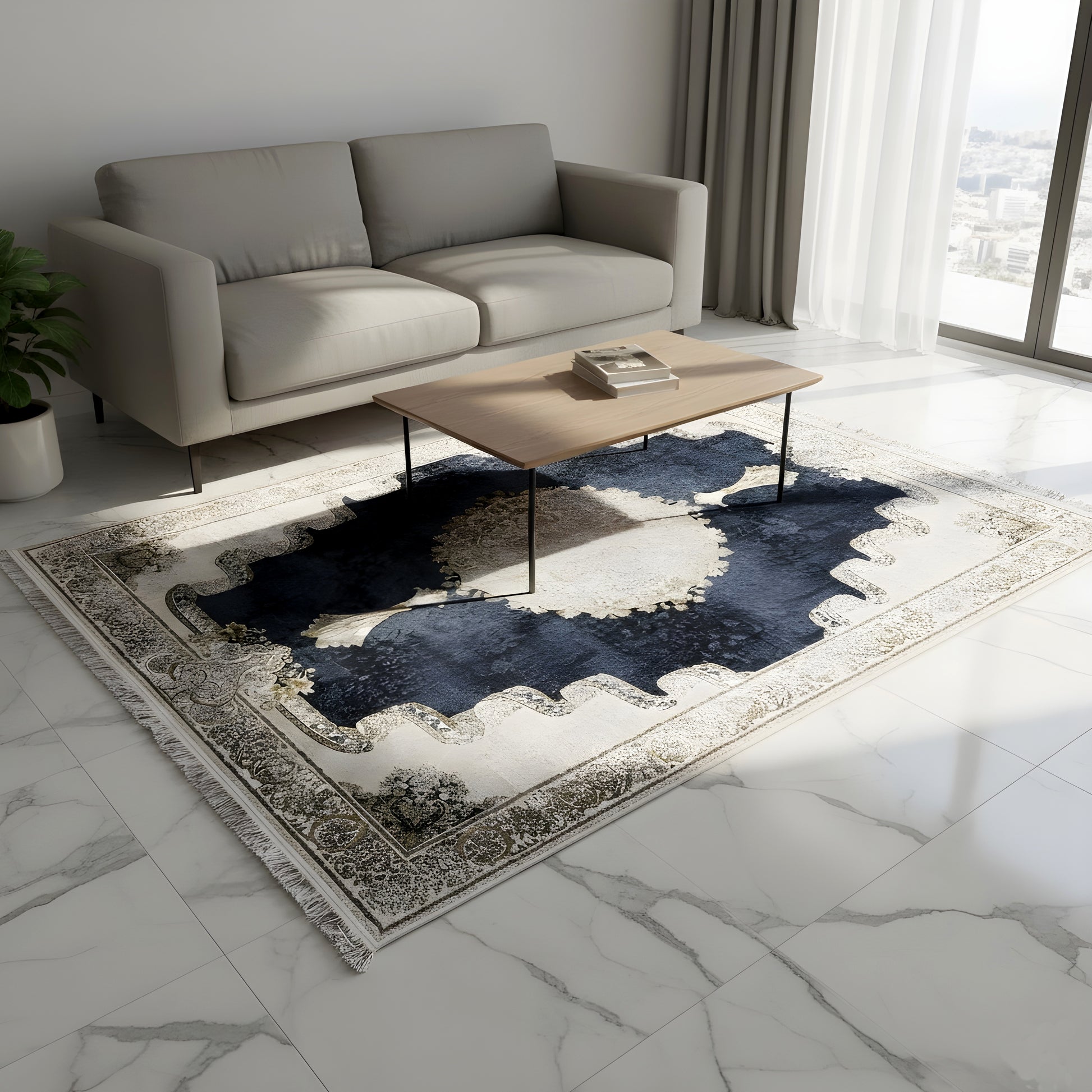 Enhance your home with the striking classic Arcadian Dusk rug. Its refined navy blue field is beautifully framed by a lighter, metallic border, creating a dramatic focal point. The central medallion and detailed border give this rug an element of artistic, traditional design. Made from 100% heat-treated acrylic, this rug offers a luxurious feel and is perfect for high-traffic areas, combining timeless style with modern durability. The generous size of 170x240cm is ideal for defining your living or bedroom space.