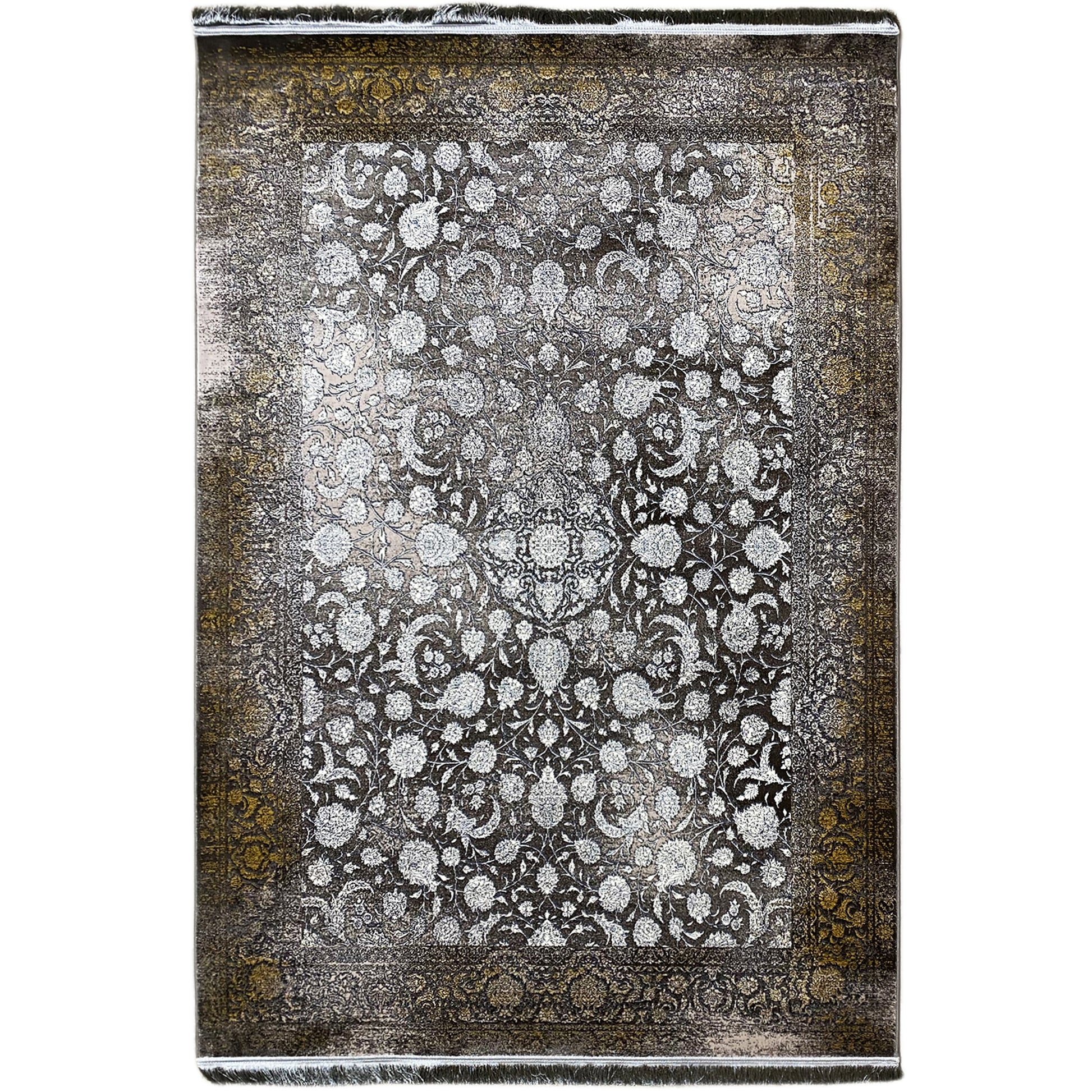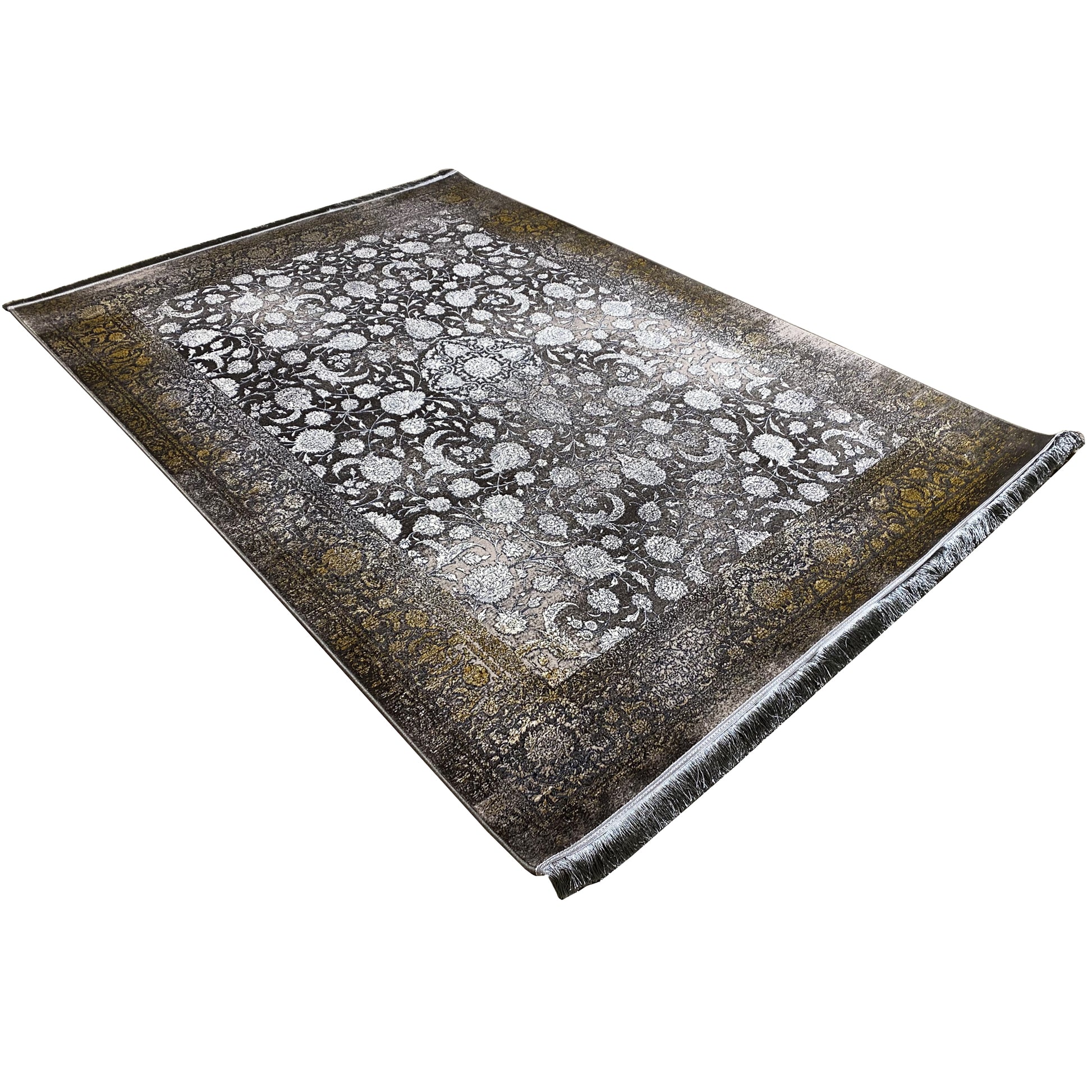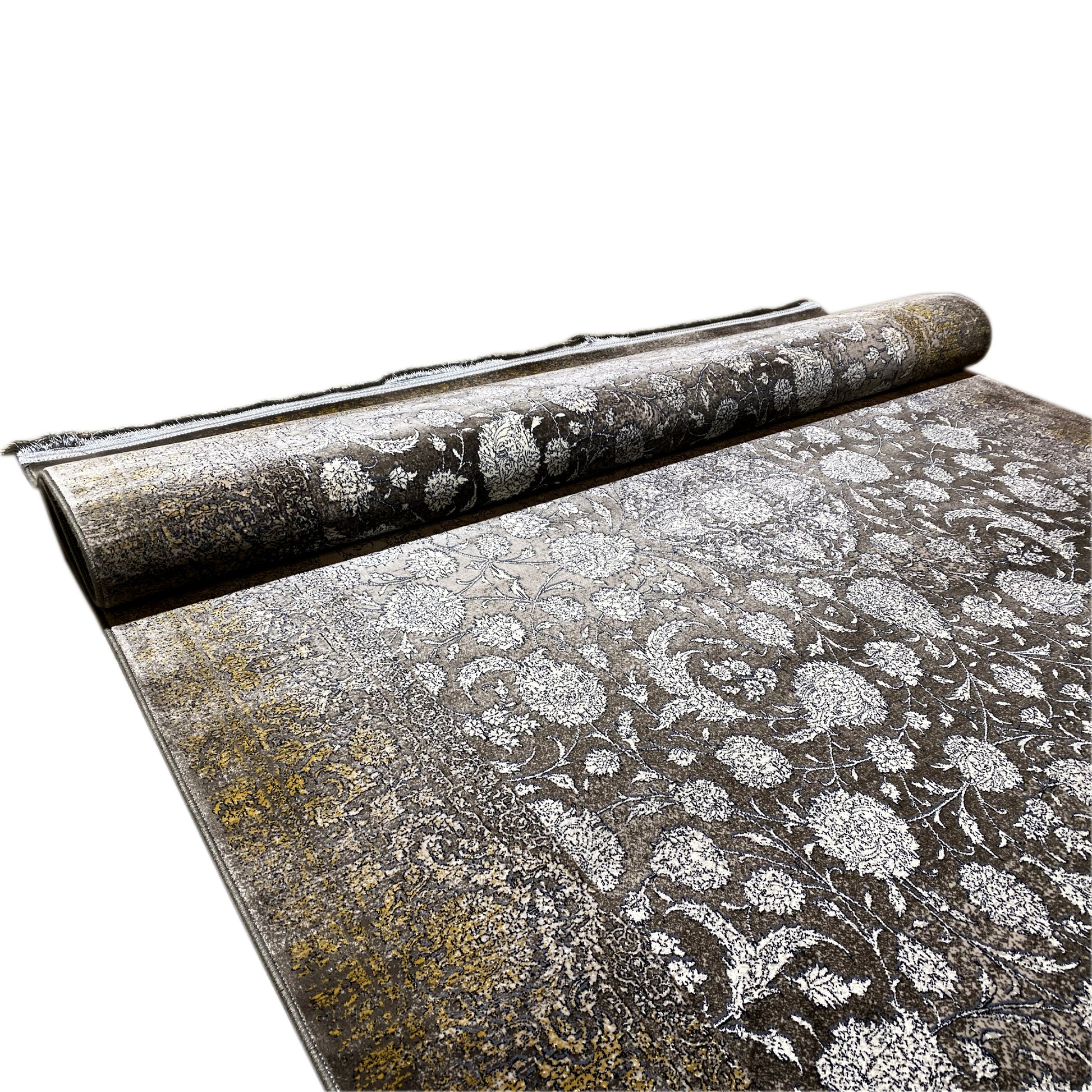 Give your home a luxurious, timeless atmosphere with this beautiful classic rug. The stunning, continuous floral pattern in shimmering gold tones elegantly stands out against a dark, smoky background, creating a refined, faded vintage look. Made from 100% heat-treated acrylic, this soft and durable rug is ideal for high-traffic areas. The generous size of 170x240cm is perfect for adding a stylish accent to your living or dining room.
