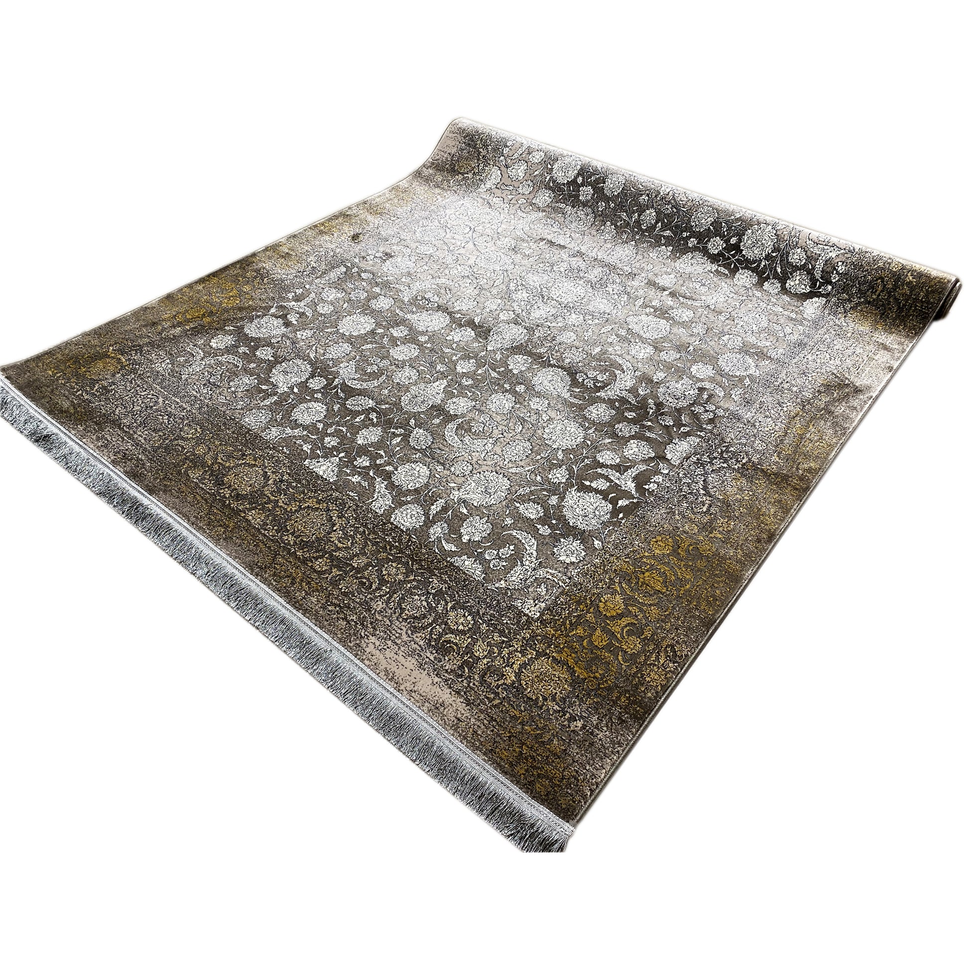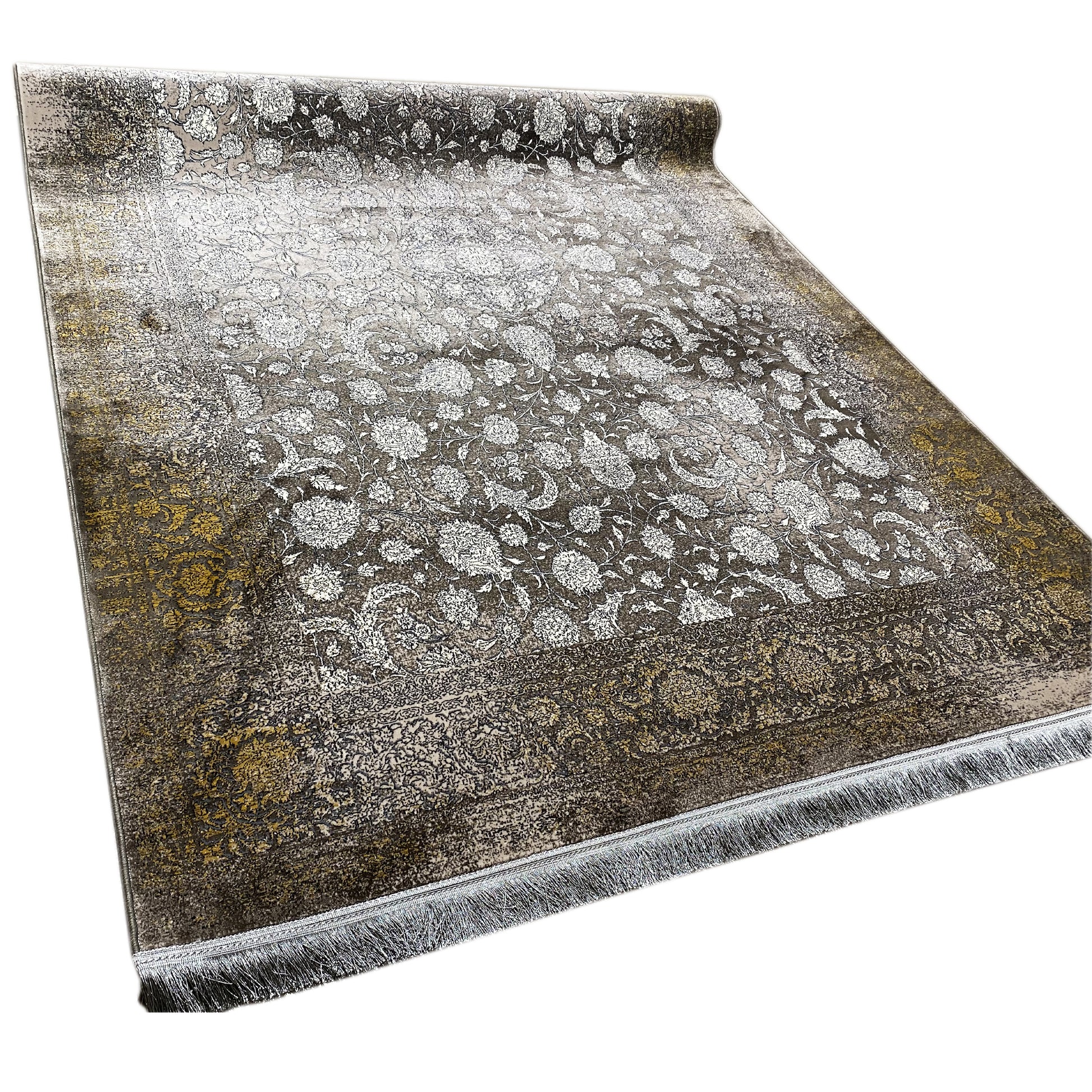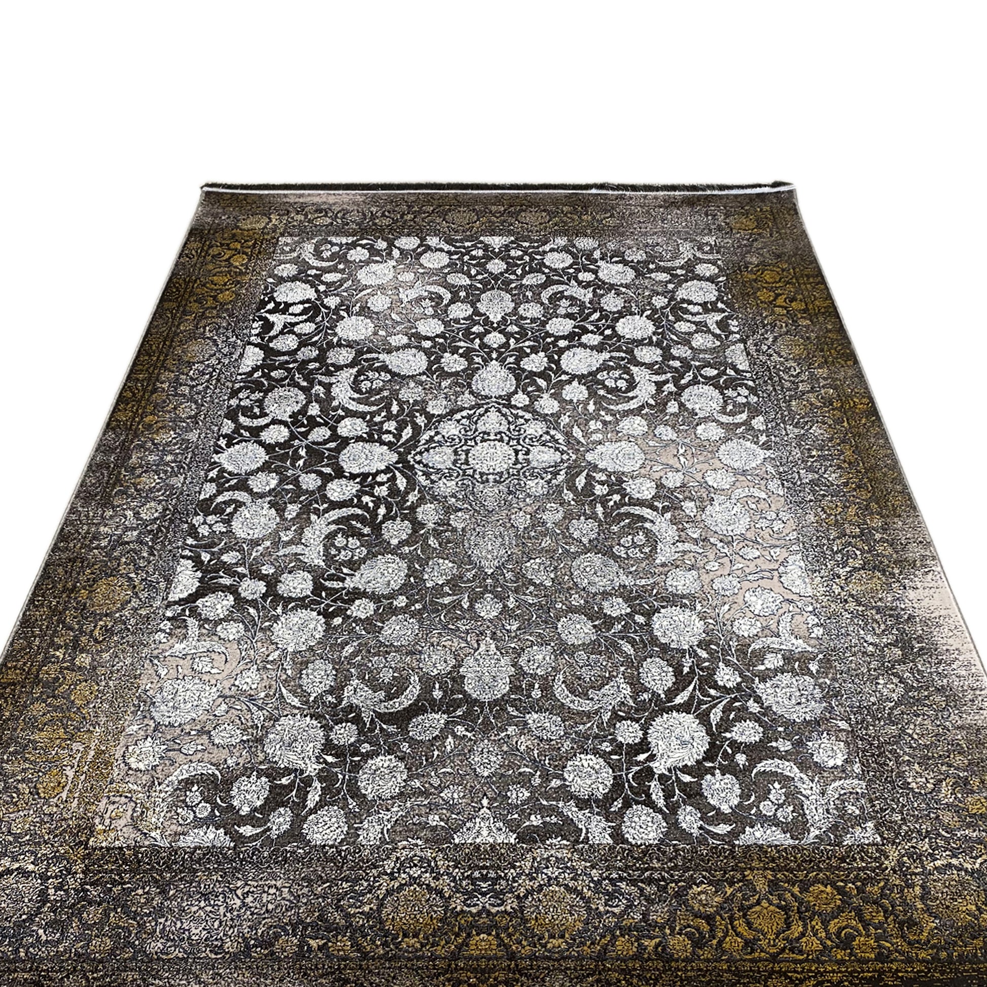 Give your home a luxurious, timeless atmosphere with this beautiful classic rug. The stunning, continuous floral pattern in shimmering gold tones elegantly stands out against a dark, smoky background, creating a refined, faded vintage look. Made from 100% heat-treated acrylic, this soft and durable rug is ideal for high-traffic areas. The generous size of 170x240cm is perfect for adding a stylish accent to your living or dining room.
