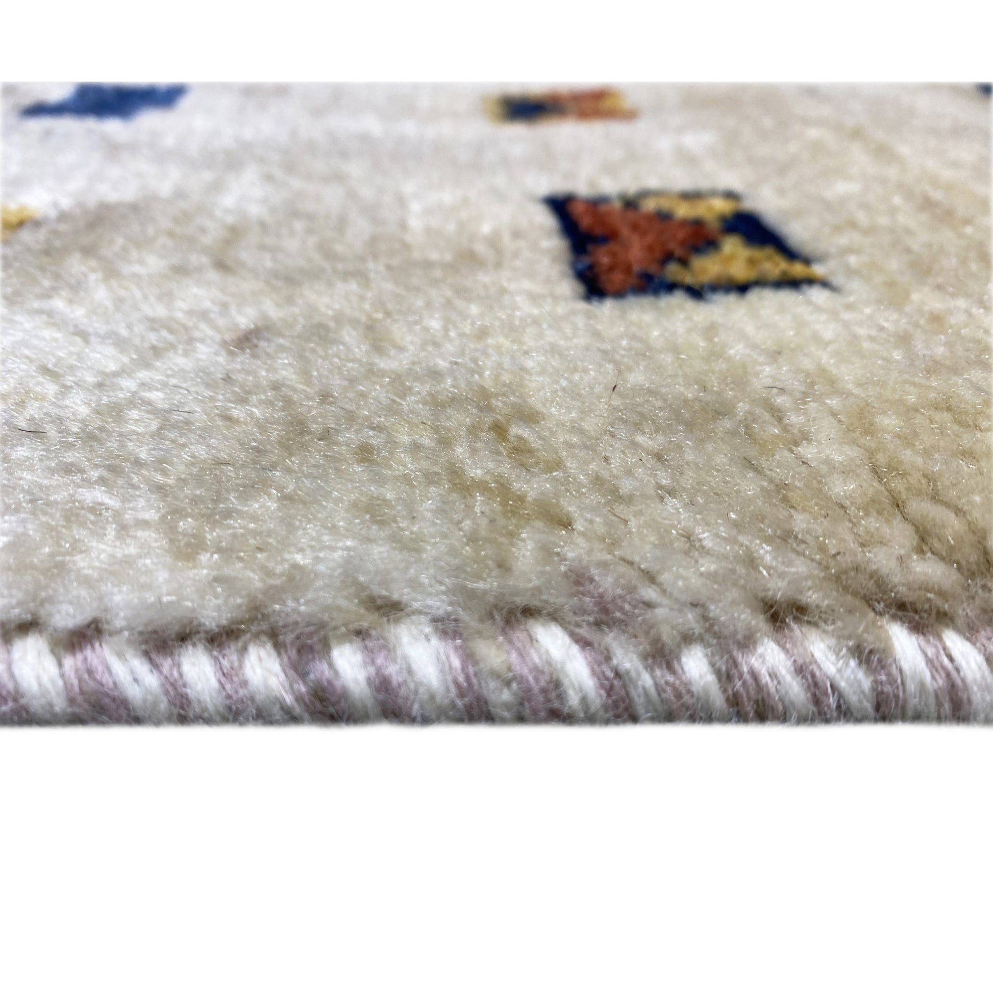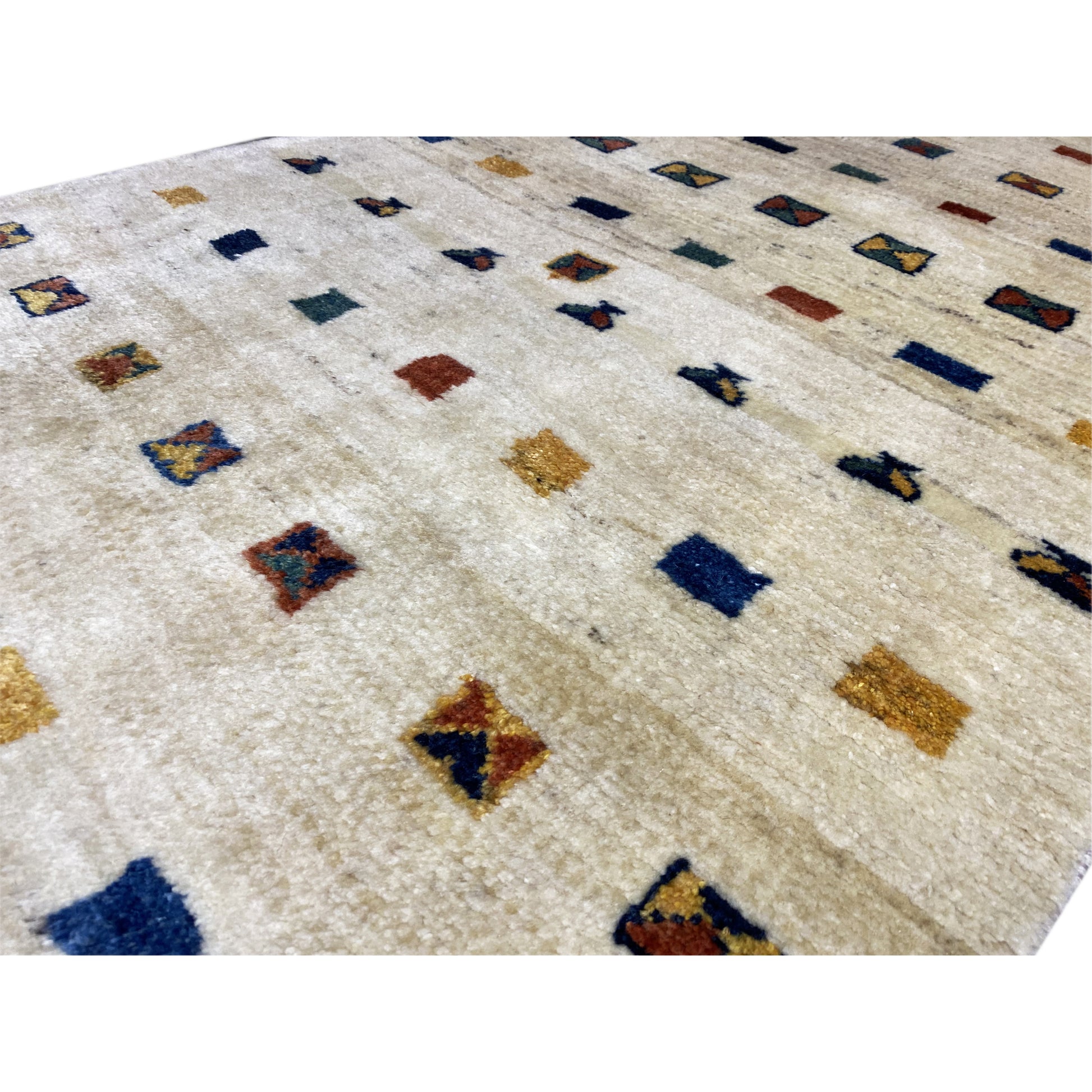 This unique, hand-knotted Gabbeh rug in the size 152x89cm is made from hand-spun, plant-dyed wool. Its modern design features a playful pattern of colorful rectangles and squares on a light beige background. It adds a lively touch to any room, whether in a modern, contemporary, or eclectic style, while bringing the natural warmth and texture of an authentic Gabbeh rug.