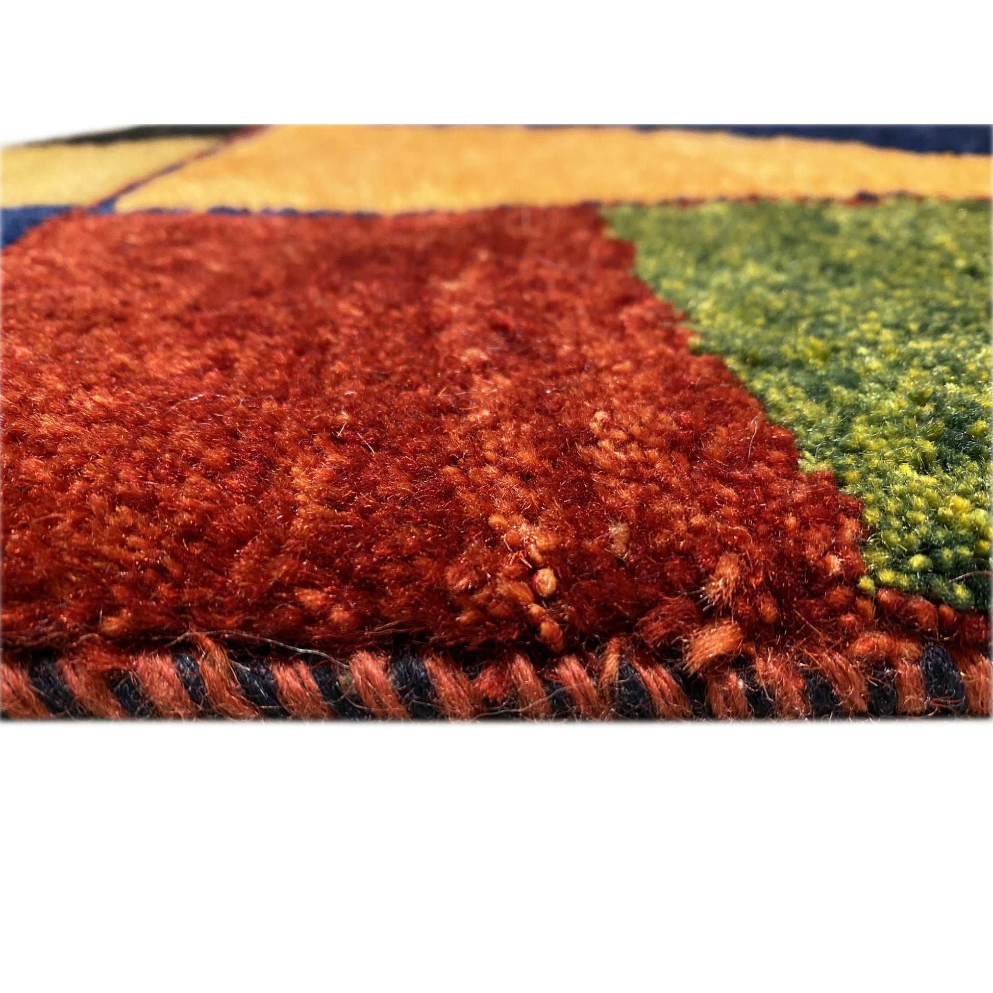This hand-knotted Gabbeh rug in 164x114cm size, made from hand-spun, plant-dyed wool, brings a natural, rustic accent to your home. The minimalist design with a central diamond pattern and vibrant colors makes it a versatile element for modern and traditional interior styles, adding warmth and character.