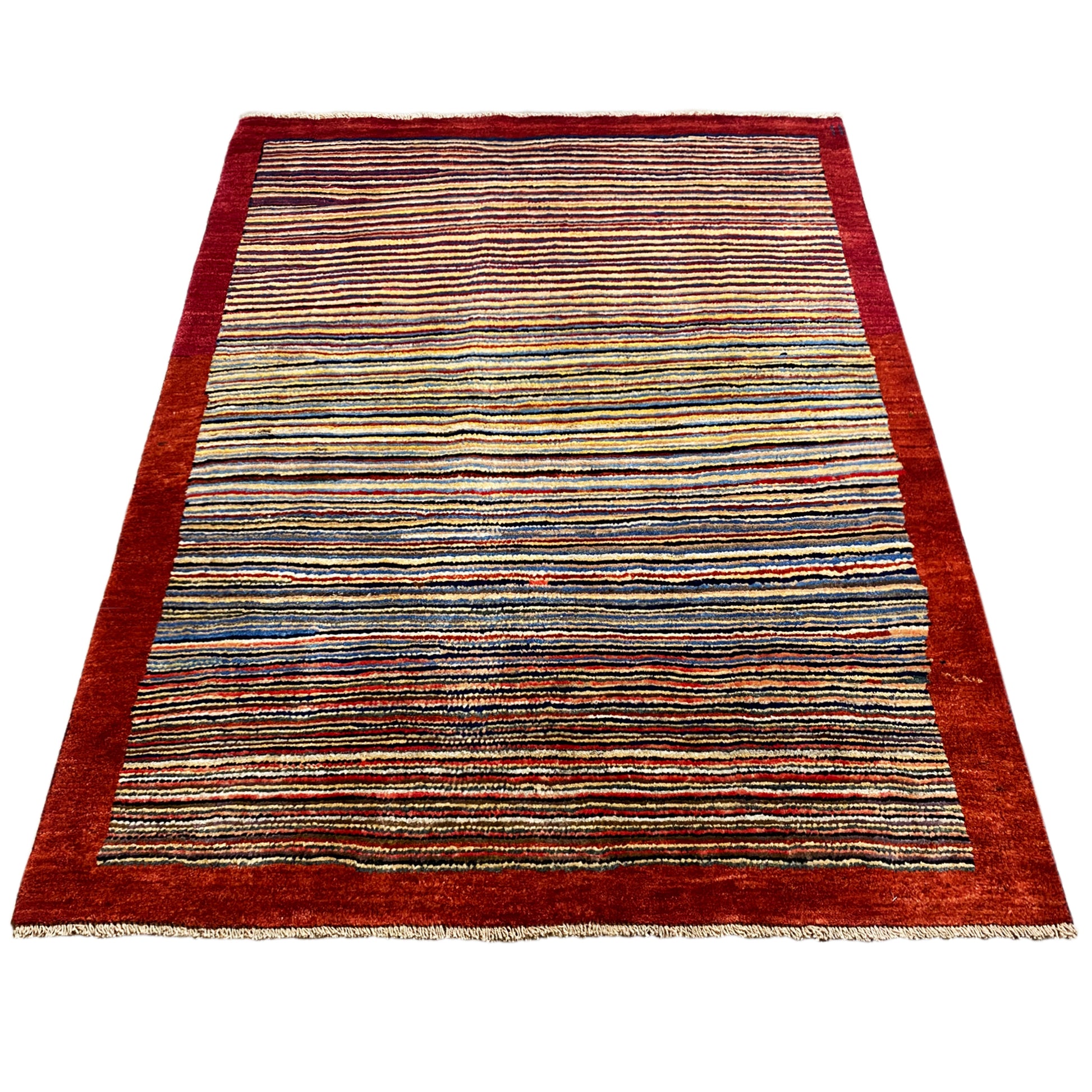 This unique, hand-knotted Gabbeh rug made from hand-spun, plant-dyed wool captivates with a lively, multicolored striped pattern, framed by a warm red border. Measuring 186x134 cm, it is a versatile statement piece that adds a playful yet earthy touch to any room, from modern to boho styles. The combination of traditional craftsmanship and dynamic design makes this rug a special eye-catcher that both draws visual interest and provides coziness.