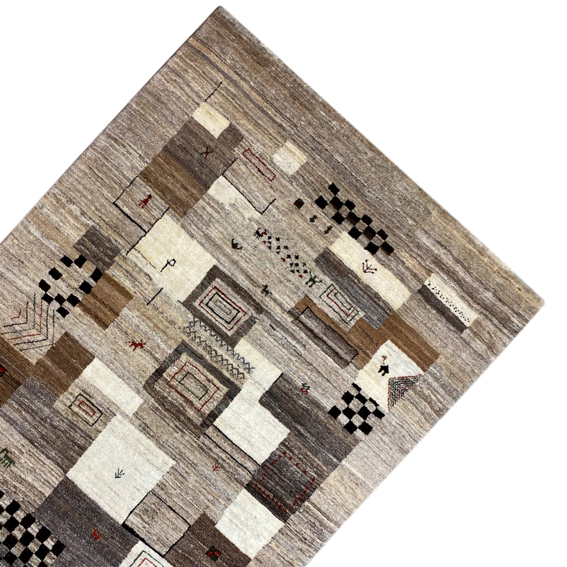 This hand-knotted Gabbeh rug made from hand-spun, plant-dyed wool brings natural elegance to any home with its modern decorative style and geometric pattern. Measuring 242x169cm, this unique rug is not only an eye-catcher but also a durable and sustainable addition to your interior, perfect for living or bedrooms.