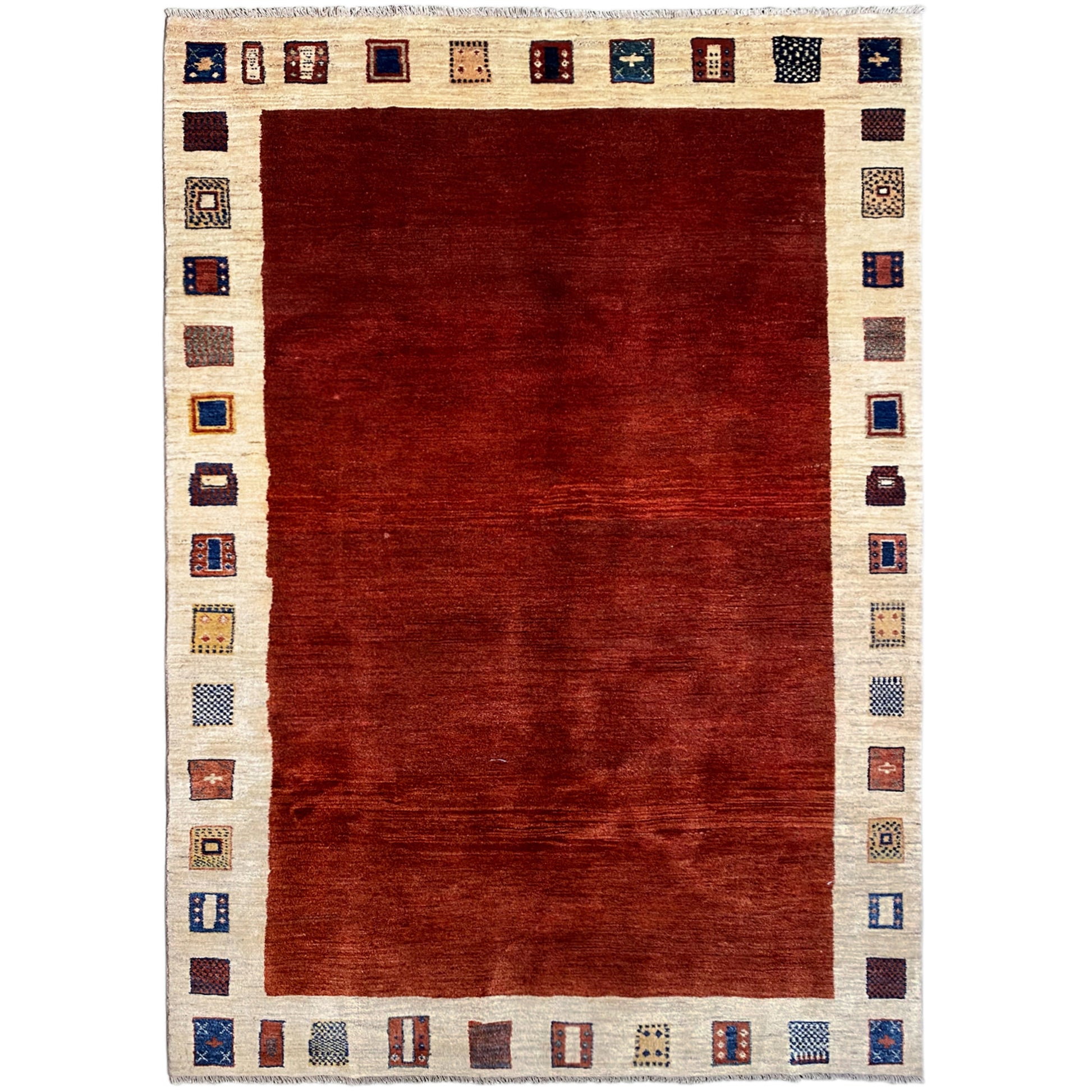 This impressive, hand-knotted Gabbeh rug made from hand-spun, plant-dyed wool features a warm red core framed by a wide beige border with colorful, geometric motifs. With its generous dimensions of 287x197 cm, it is a central eye-catcher that adds a cozy yet artistic atmosphere to any living space. The harmonious interplay of the strong main color and the playful details of the border makes this rug a versatile element that fits both traditional and modern interior styles while telling a story of craftsmanship.