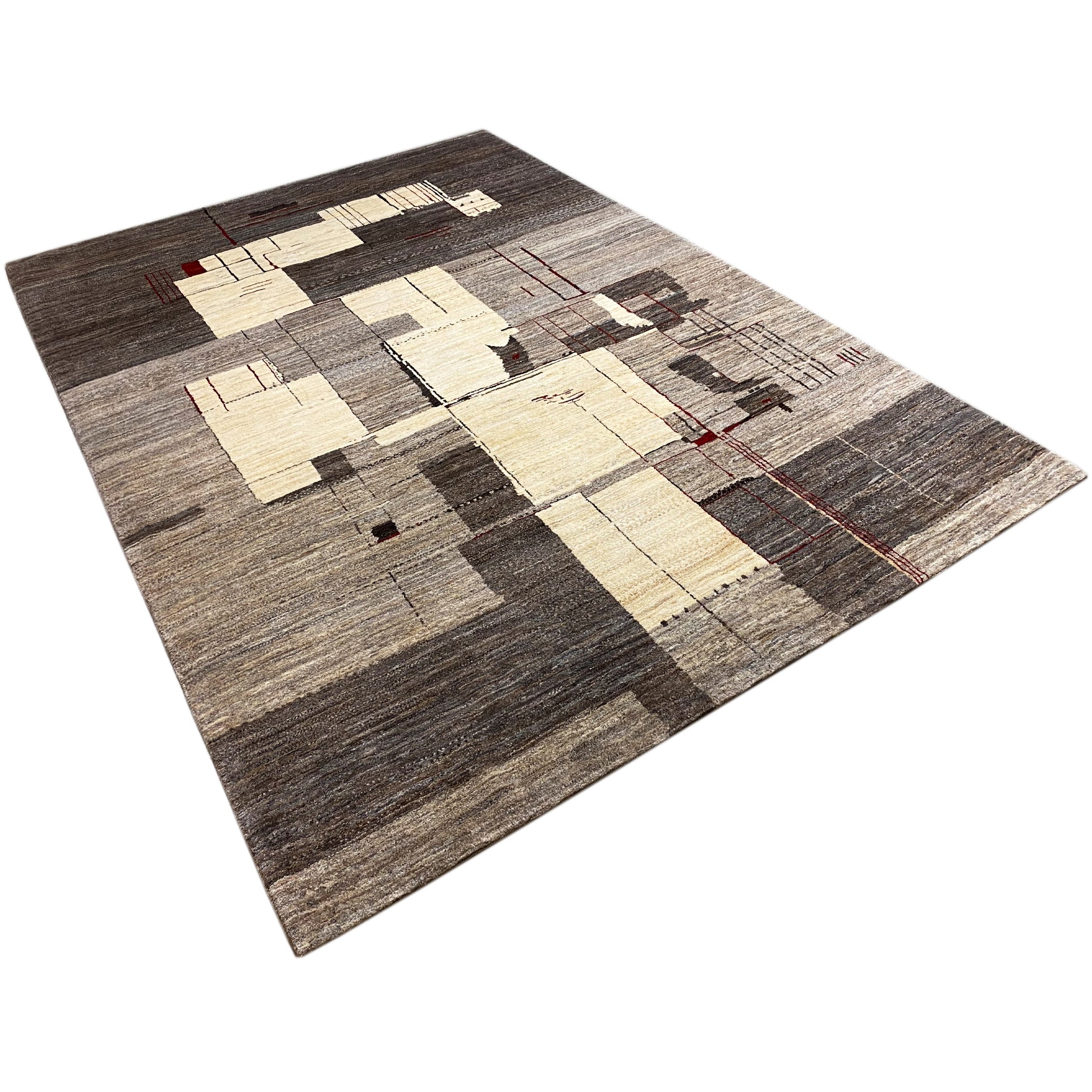 This hand-knotted Gabbeh rug made from hand-spun, plant-dyed wool features a modern decorative style and an abstract pattern. Measuring 302x209cm, this unique rug in shades of gray offers a stylish and durable addition that gives your living space a contemporary touch.