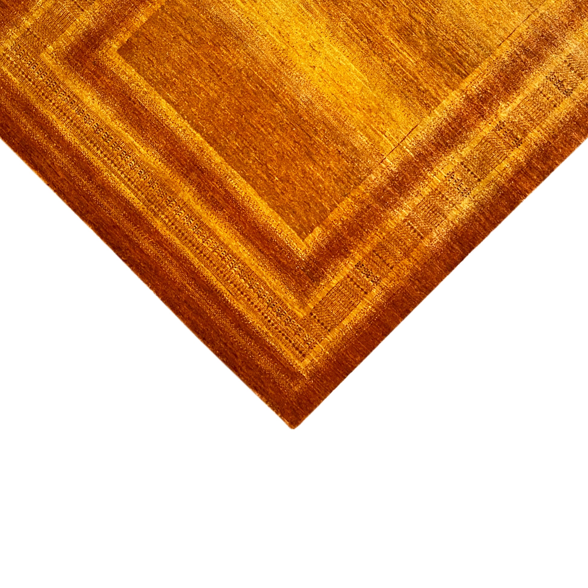 A radiant Gabbeh Luri rug in warm golden tones with a harmonious color gradient and subtle double border. Hand-knotted from natural wool and traditionally plant-dyed – this 215x161 cm rug adds a cozy ambiance and timeless elegance to any room.