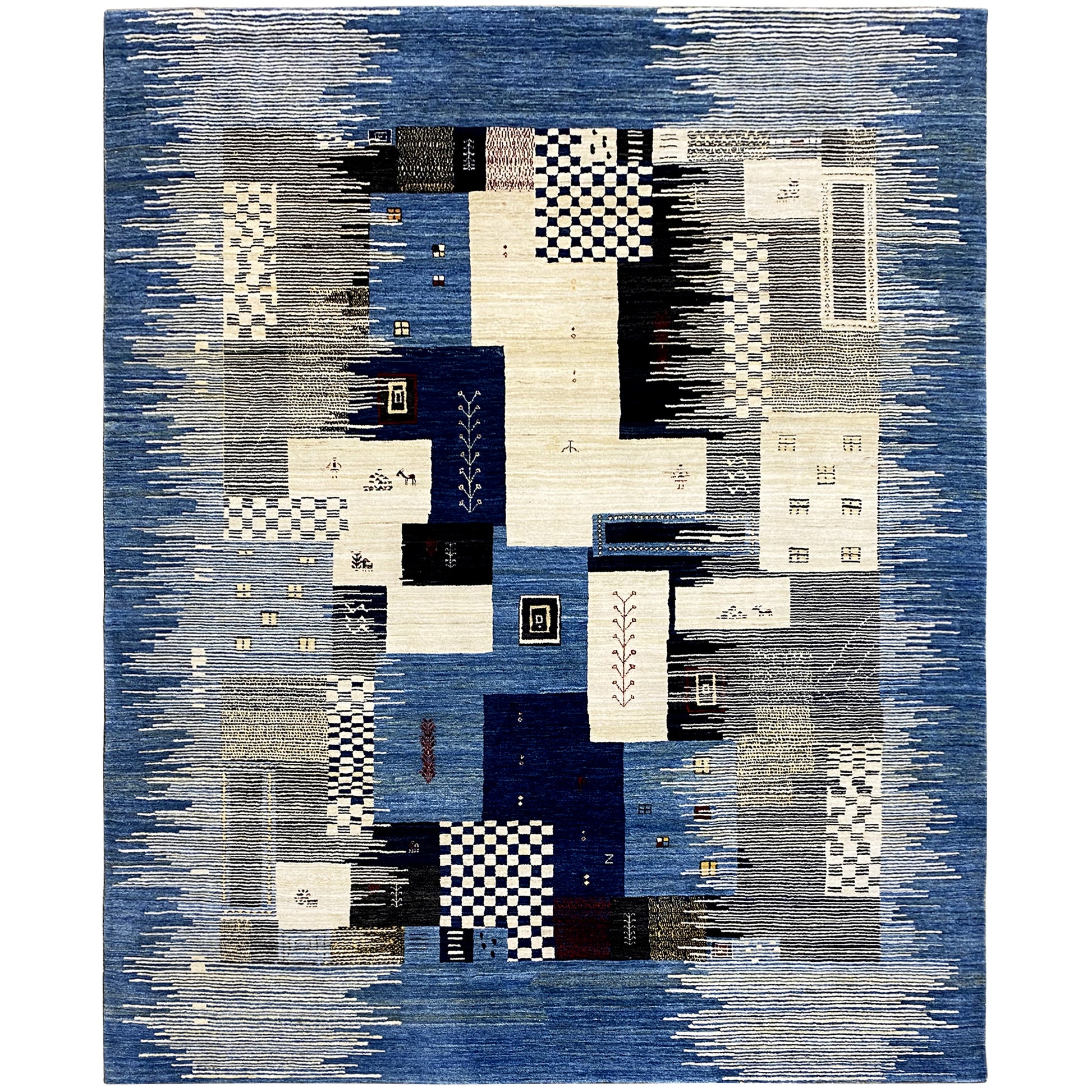 This hand-knotted Gabbeh rug made from hand-spun, plant-dyed wool enriches your home with its modern decorative style. It features a unique, abstract pattern in various shades of blue, gray, and beige, creating a calming atmosphere. With a size of 300x195 cm, it is ideal for living or dining rooms. The high-quality craftsmanship and durable new wool guarantee longevity and utmost comfort.