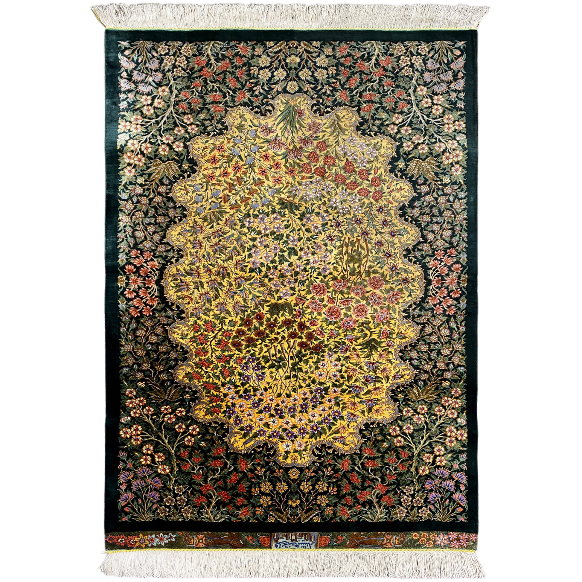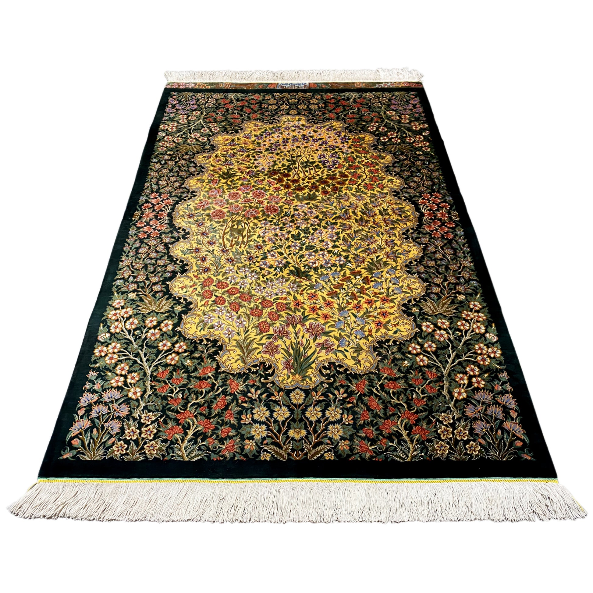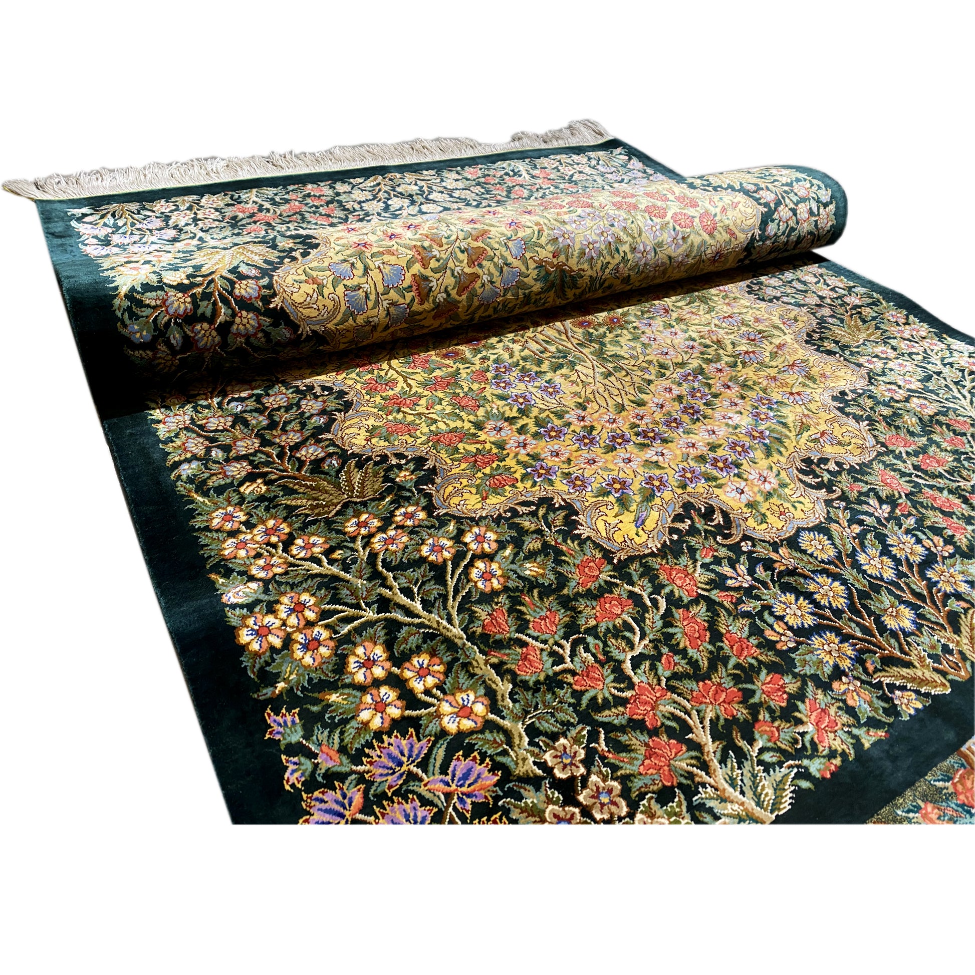 Ghom carpets are knotted in Central Persia in the city of Ghom. A silk carpet from Ghom impresses even collectors of Persian carpet art. The material of the carpets is silk, which makes them thin and dense. They are among the finest and most exquisite Persian carpets and captivate with their unique shine.