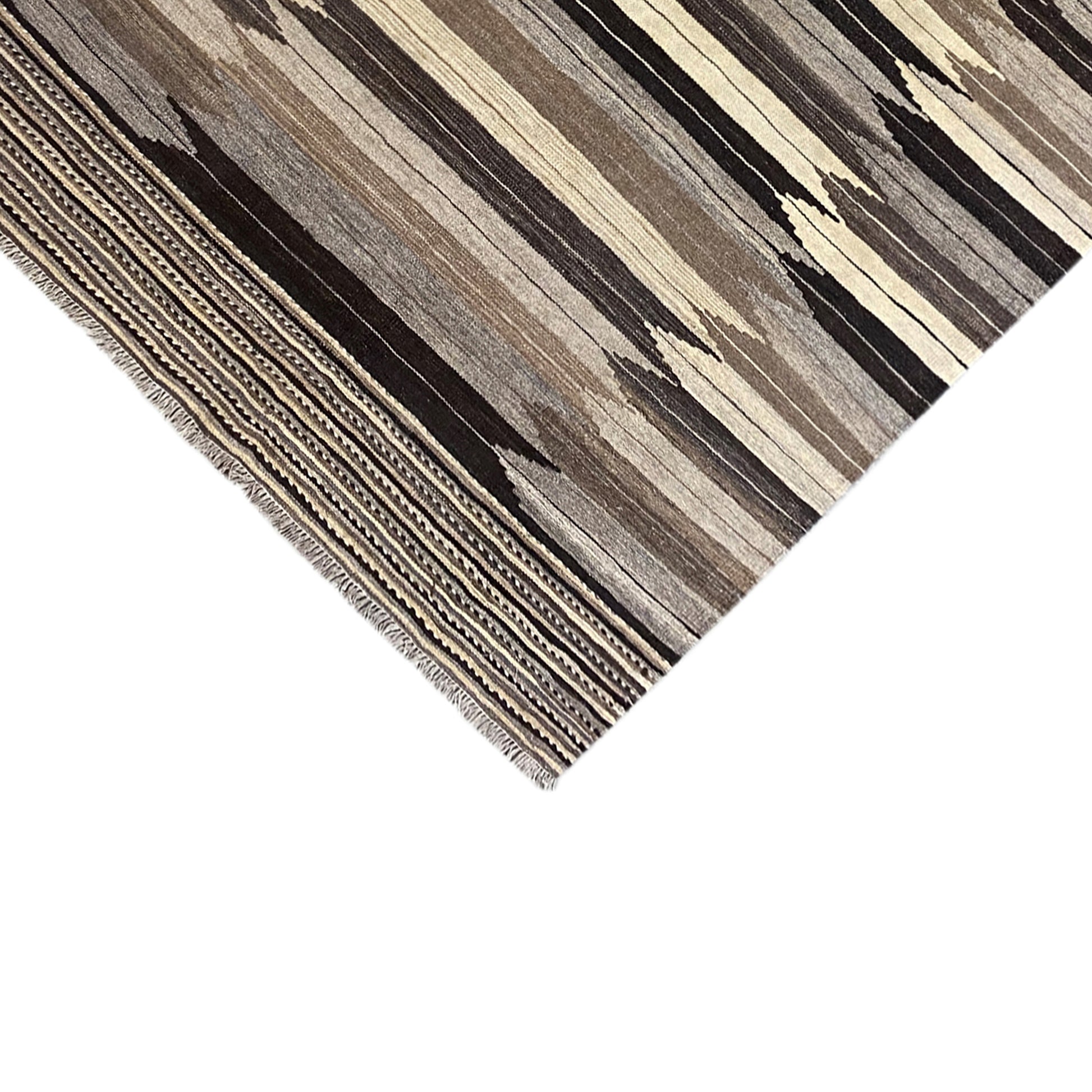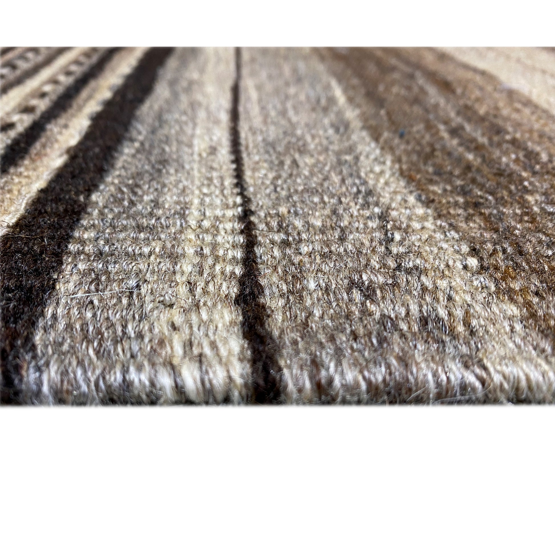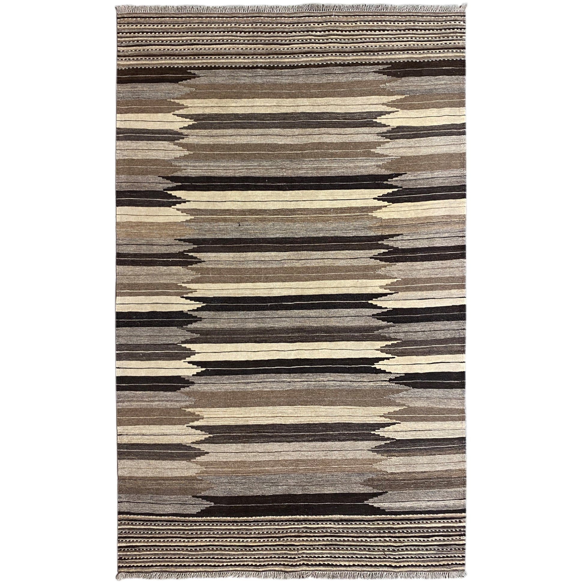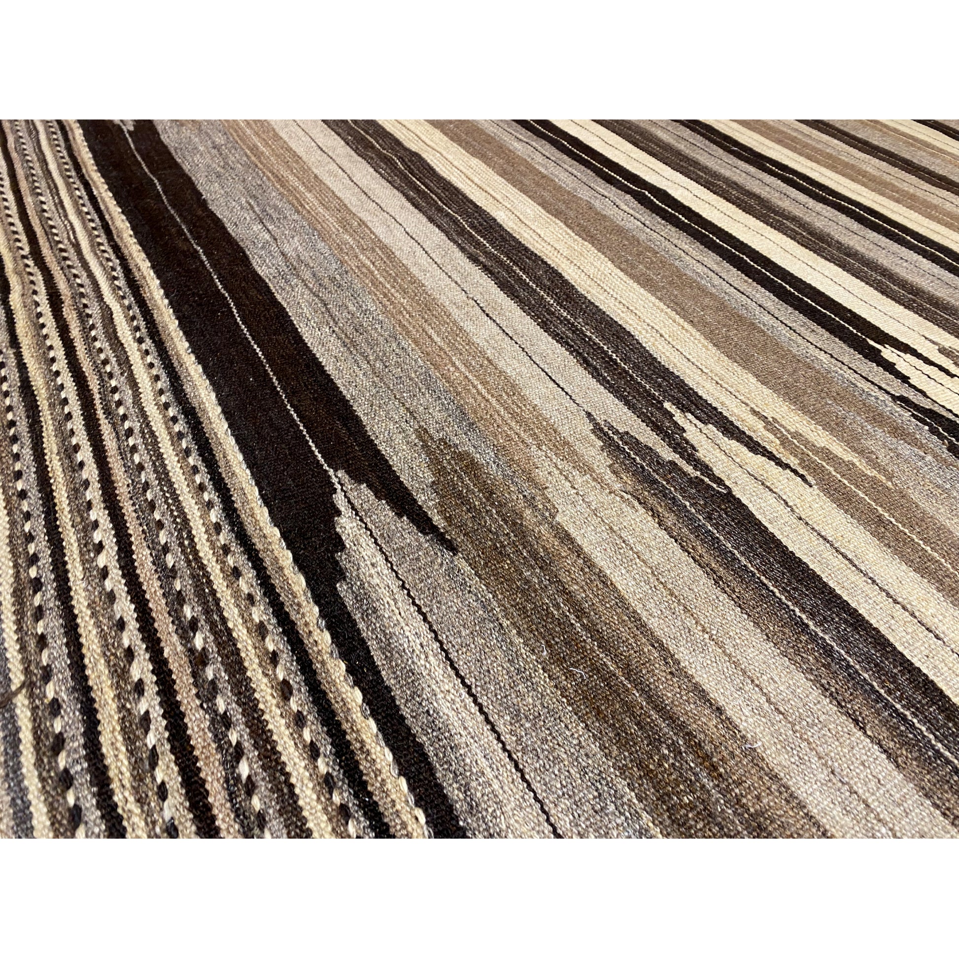 This handwoven Kelim Qashqai made from hand-spun wool features a striking striped pattern in natural gray and beige tones, giving any room a modern yet earthy touch. With a generous size of 217x142 cm, this durable flatweave rug is perfect for living rooms or dining areas and offers a long-lasting, easy-to-care-for surface. Its unique design combines traditional craftsmanship with contemporary aesthetics, creating a warm, inviting atmosphere.