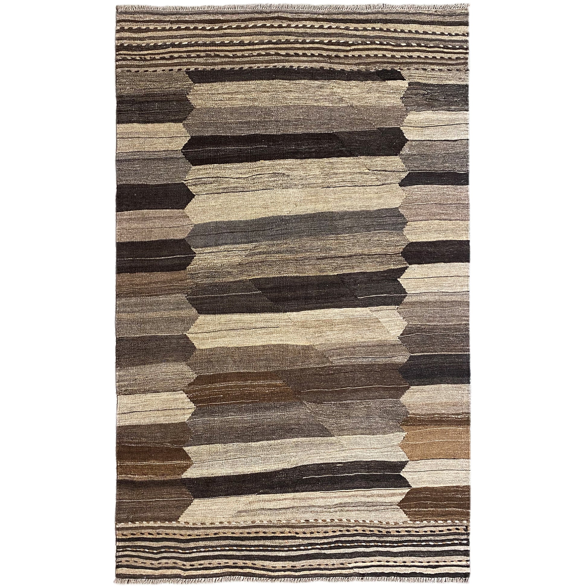 This fascinating handwoven Kelim Qashqai made from hand-spun wool features a modern, striped pattern in warm brown and gray tones. Measuring 219x136 cm, this sturdy flatweave rug is a stylish addition to various interior styles such as modern, Scandinavian, or tribal. It offers not only a durable and easy-care surface but also the natural beauty and texture of pure wool, ideal for giving your home a cozy and contemporary atmosphere.