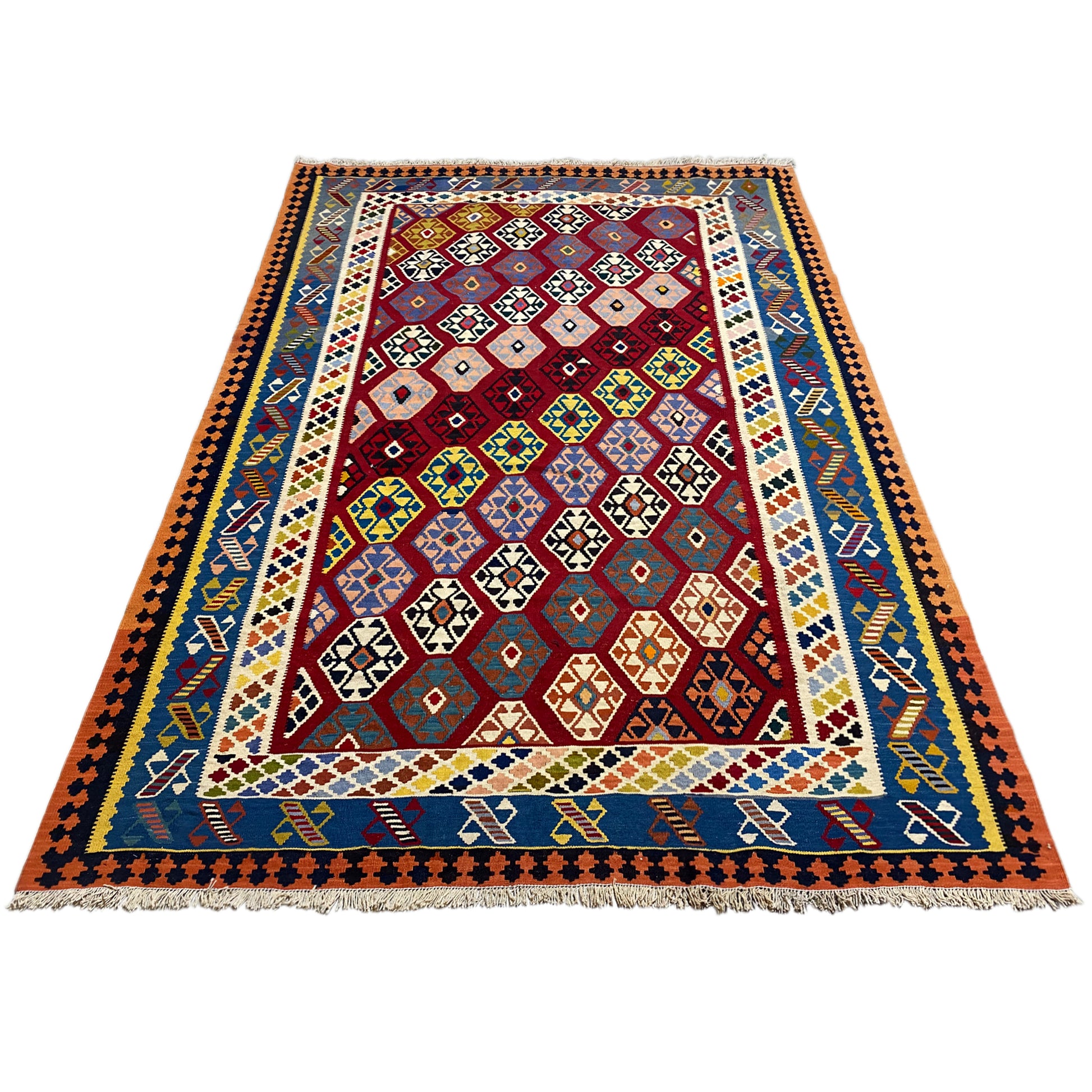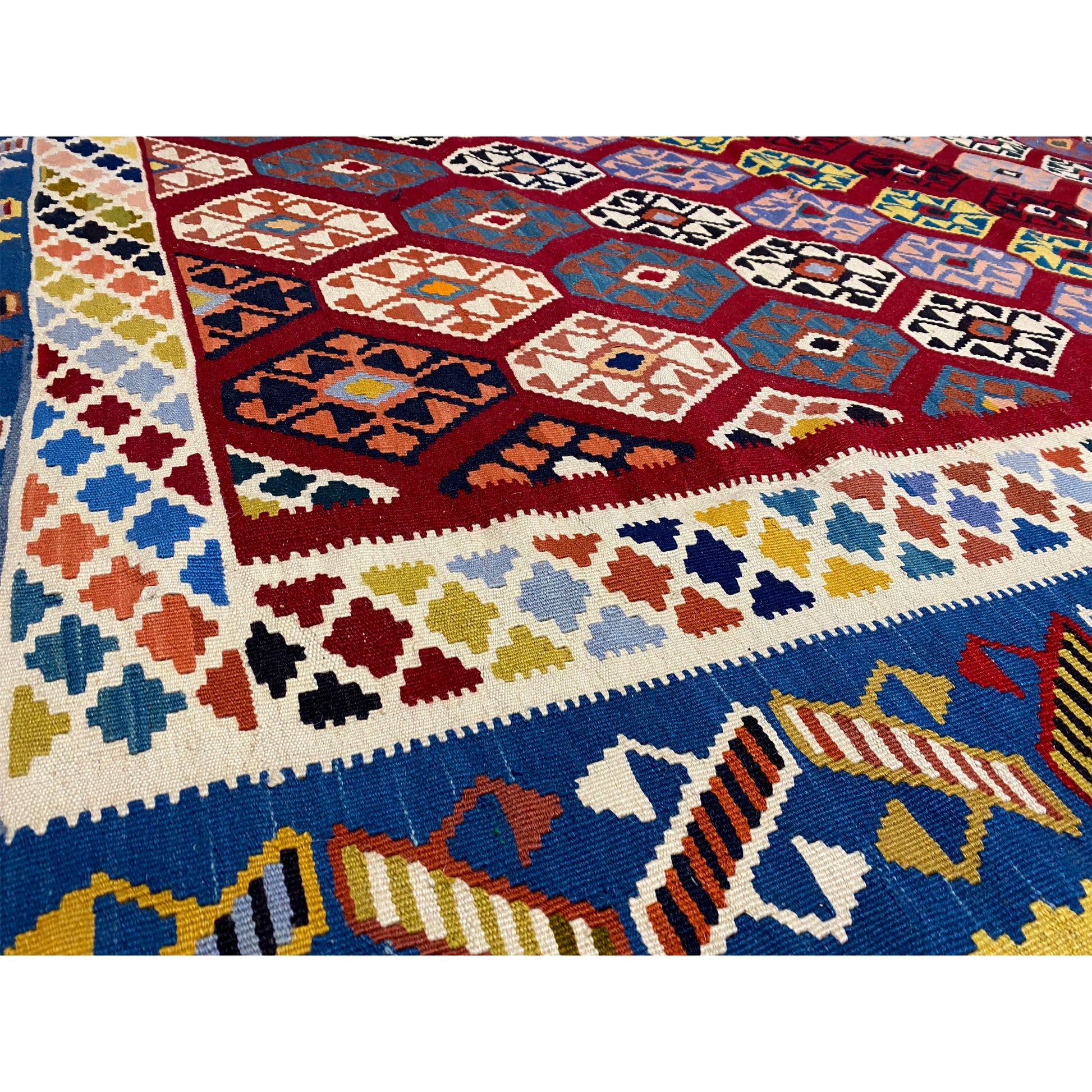This magnificent handwoven Qashqai kilim made from hand-spun wool features a rich, multicolored design and a size of 249x186 cm, ideal for larger rooms. The central red field is filled with a wealth of detailed diamond patterns, surrounded by vibrant blue and orange borders with intricate geometric motifs. Perfect for tribal, boho, or traditional decor styles, this durable flatweave rug not only offers an impressive look but also the natural warmth and durability of pure wool, adding an authentic and colorful accent to your home.