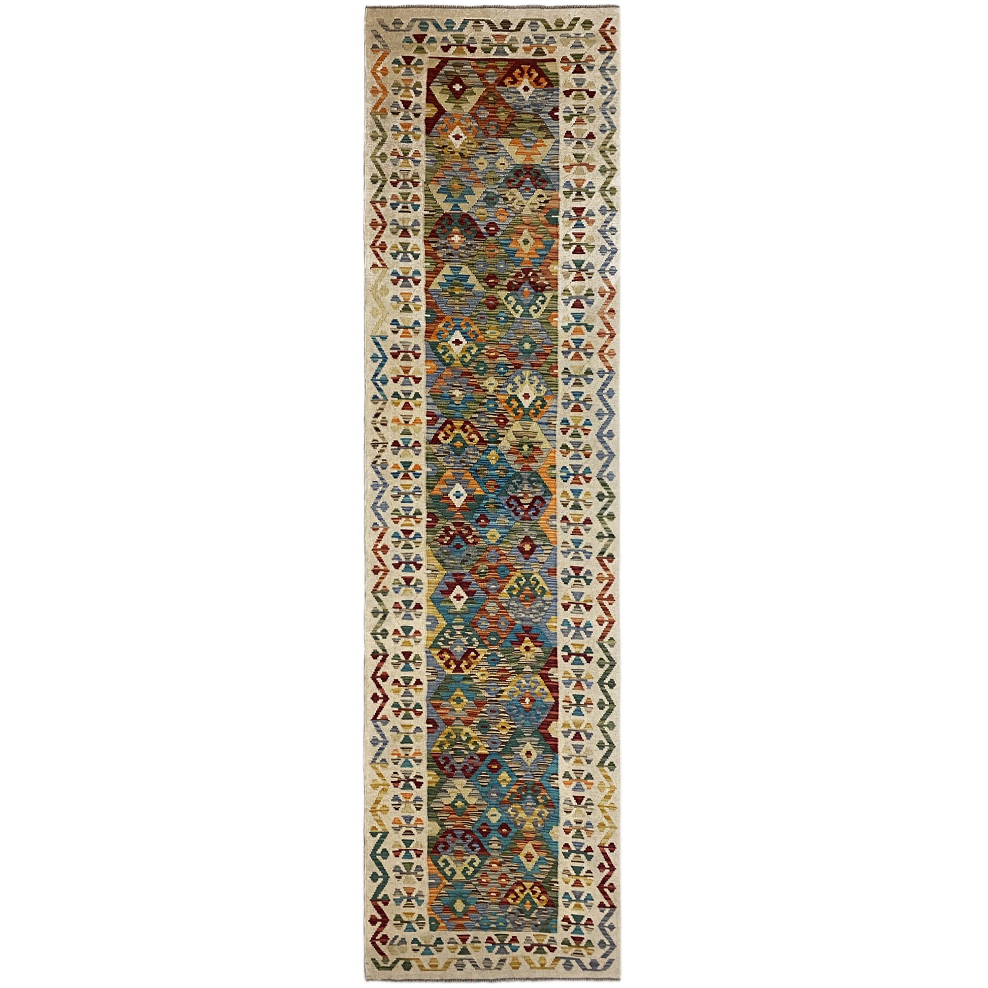 This unique, handwoven Kilim Afghan runner in the size 386x87cm is made from hand-spun wool. The central, multi-colored field features a complex, geometric diamond and zigzag pattern, framed by wide beige borders with smaller tribal motifs. Perfect for long hallways and corridors, this runner adds a vibrant, ethnic charm to any room and the robust beauty of traditional Afghan craftsmanship.