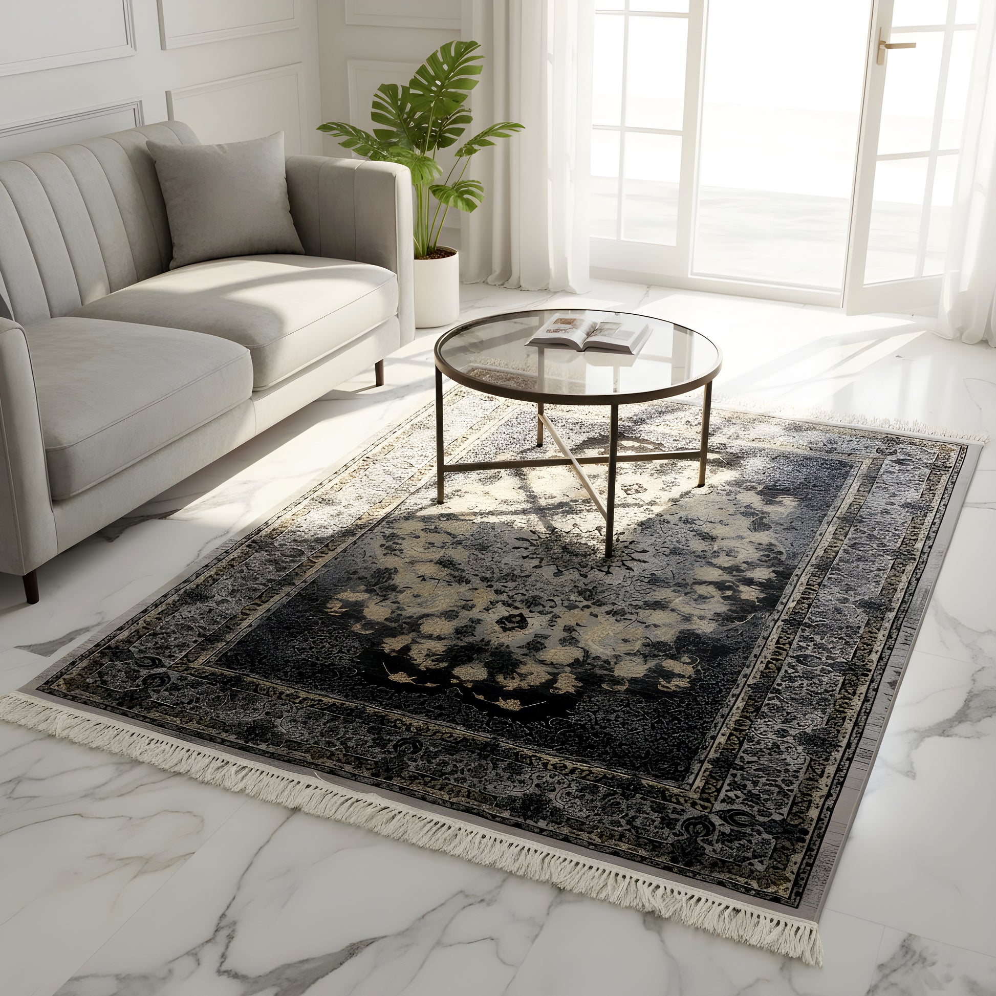 This impressive, machine-woven rug in the size 160x230 cm is a stylish eye-catcher for modern and classic living spaces. The durable polypropylene pile material ensures longevity and easy cleaning, perfect for high-traffic areas. The rug features an artistic, oriental-inspired pattern in elegant dark gray and anthracite tones, accented by a central medallion in gold and beige. This sophisticated classic design with a glamour factor creates a striking yet luxurious atmosphere. Add profound elegance to your living room or dining room with this rug.