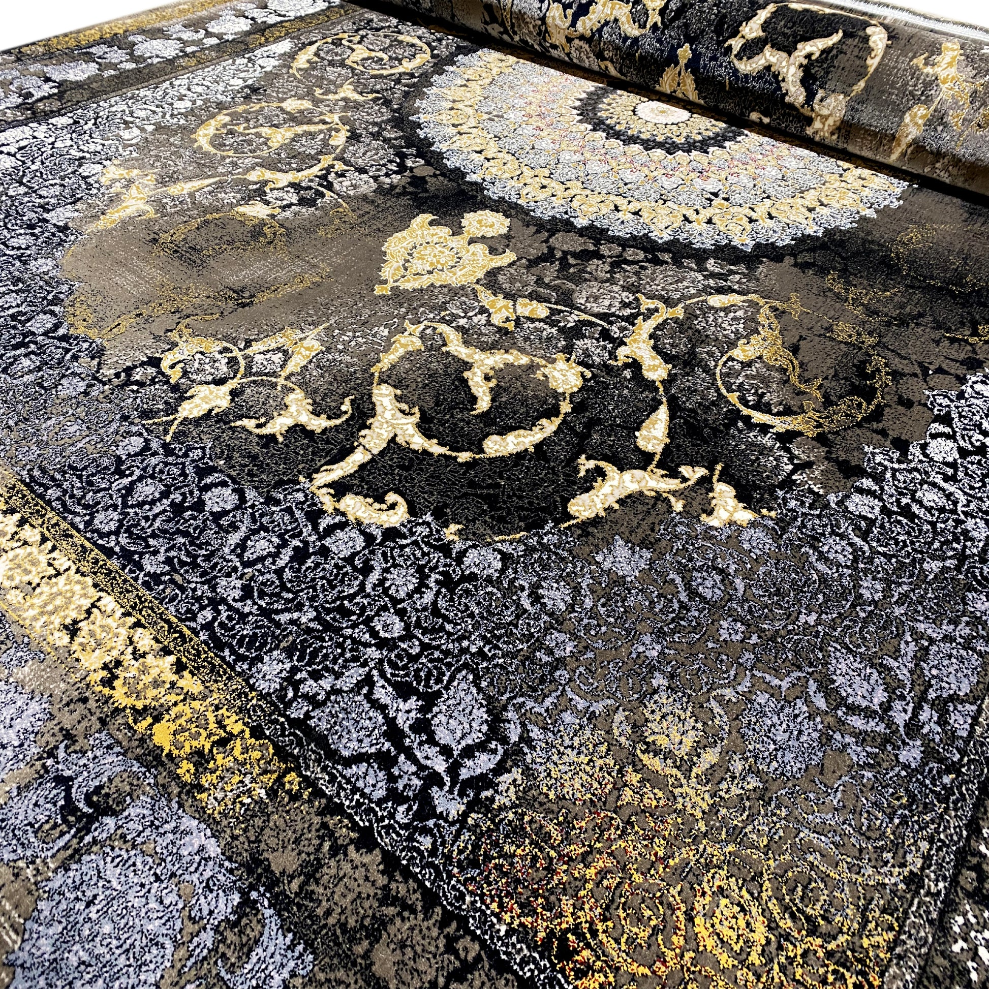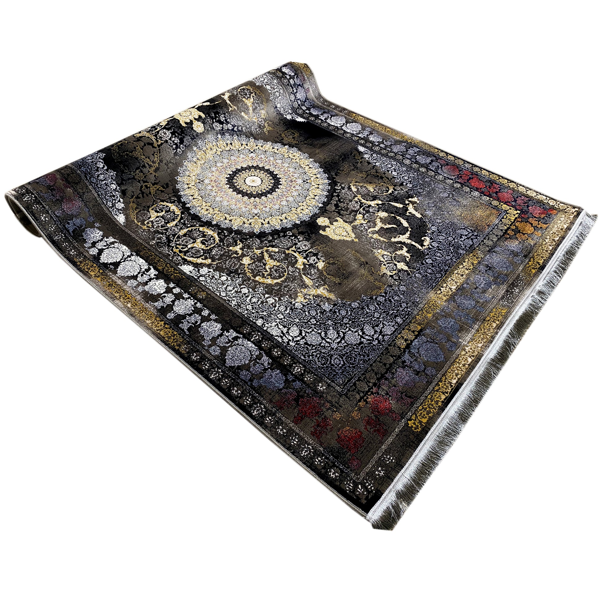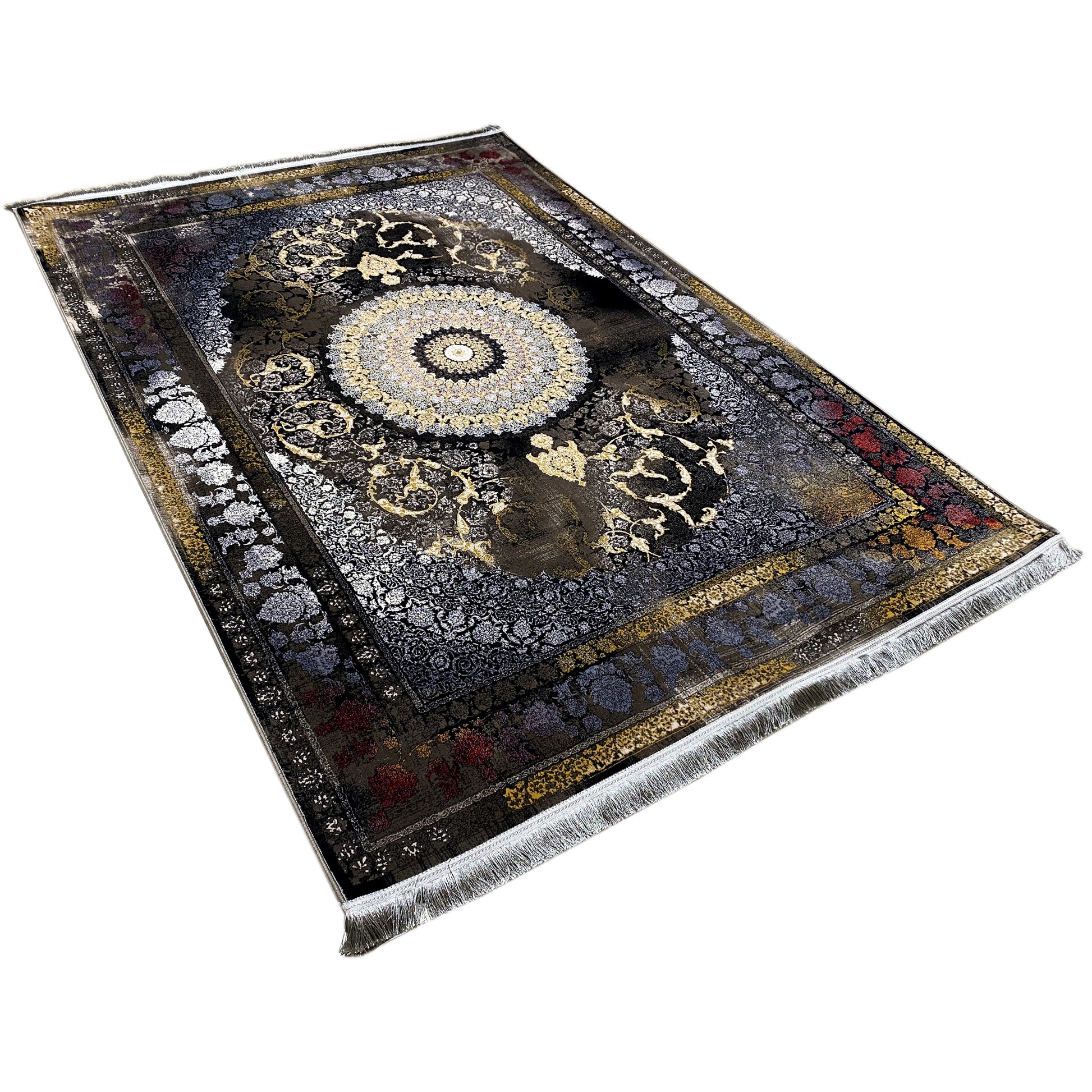 Give your home dramatic elegance with this beautiful modern classic rug. Its striking circular medallion in gold tones stands out against a smoky, faded background, creating a luxurious, timeless look. Made from 100% heat-treated acrylic, this soft and durable rug is perfect for high-traffic areas, combining exquisite style with modern resilience. The generous size of 170x240cm is ideal for adding a refined focal point to your living or bedroom.