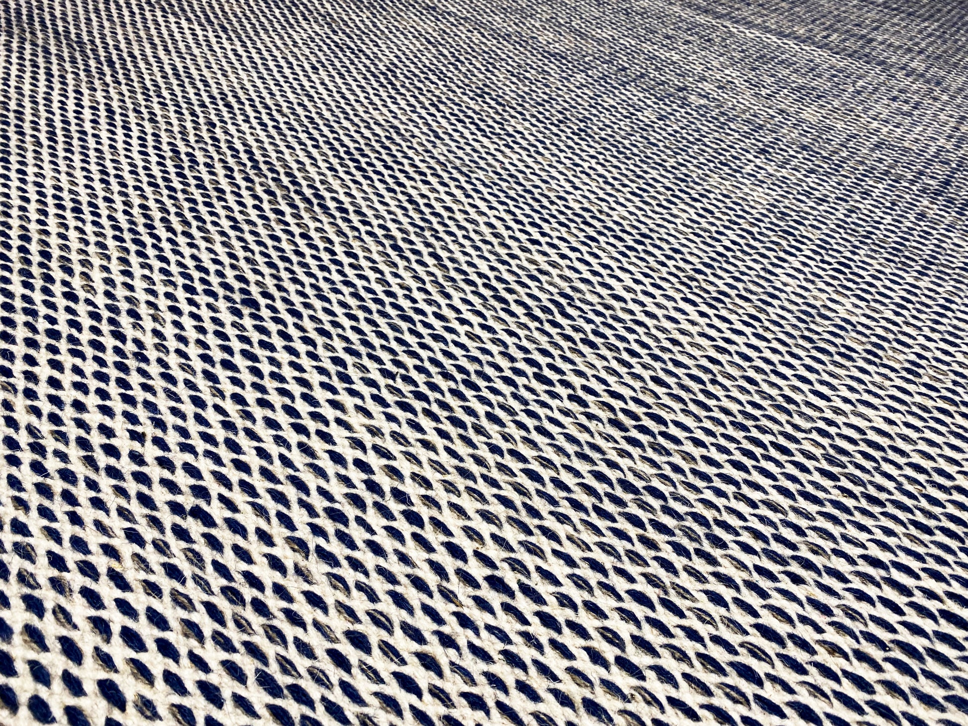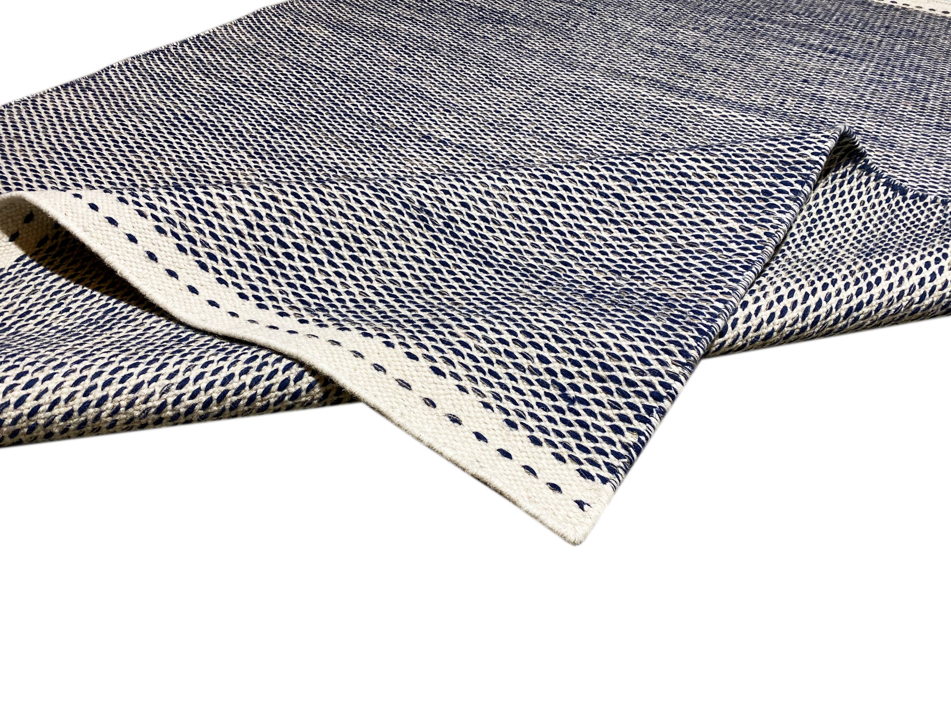 Give your home a maritime yet modern touch with this handwoven kilim rug made from 100% high-quality wool. The generous size of 160x230 cm makes it the perfect companion for your living or bedroom, while the fine white dot pattern on a deep blue background creates an elegant contrast. This rug in Scandinavian design impresses with its first-class craftsmanship and natural, breathable materials that ensure a healthy indoor climate. It is extremely durable, easy to care for, and reversible, making it a sustainable and stylish choice for any sophisticated interior style.