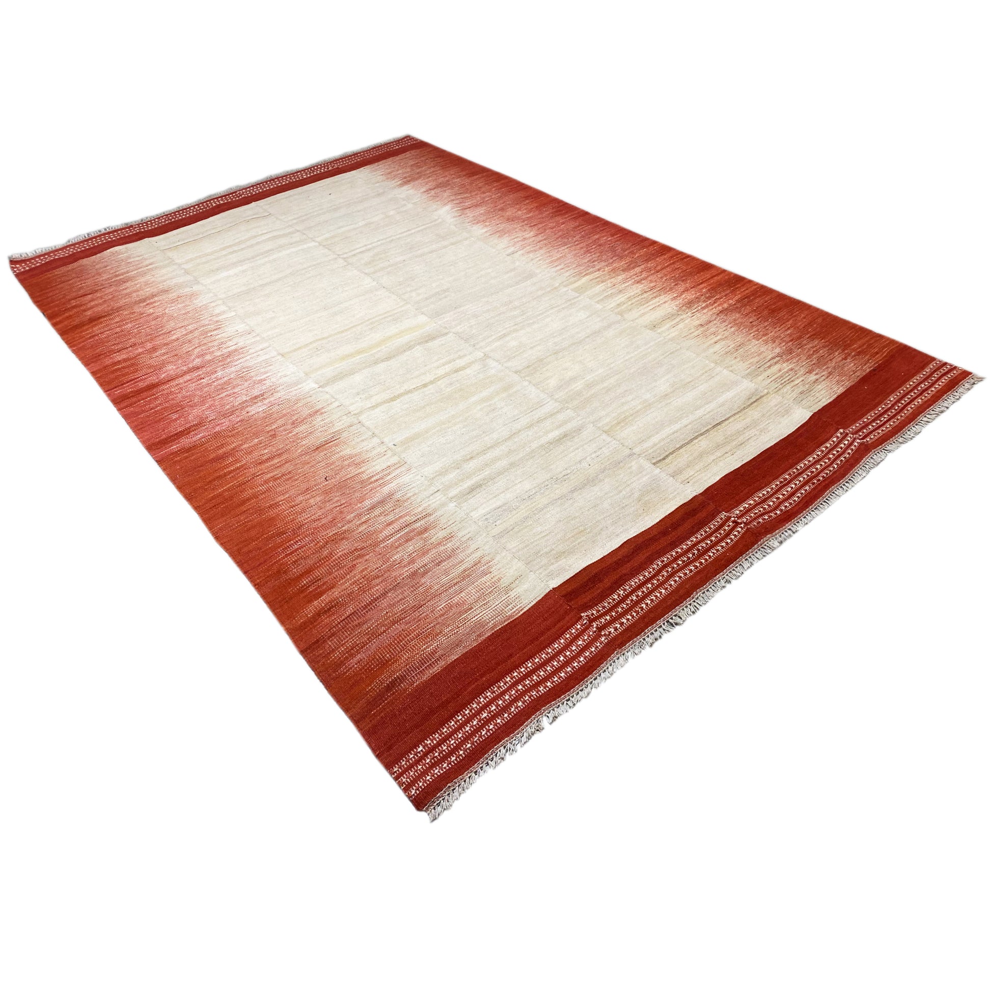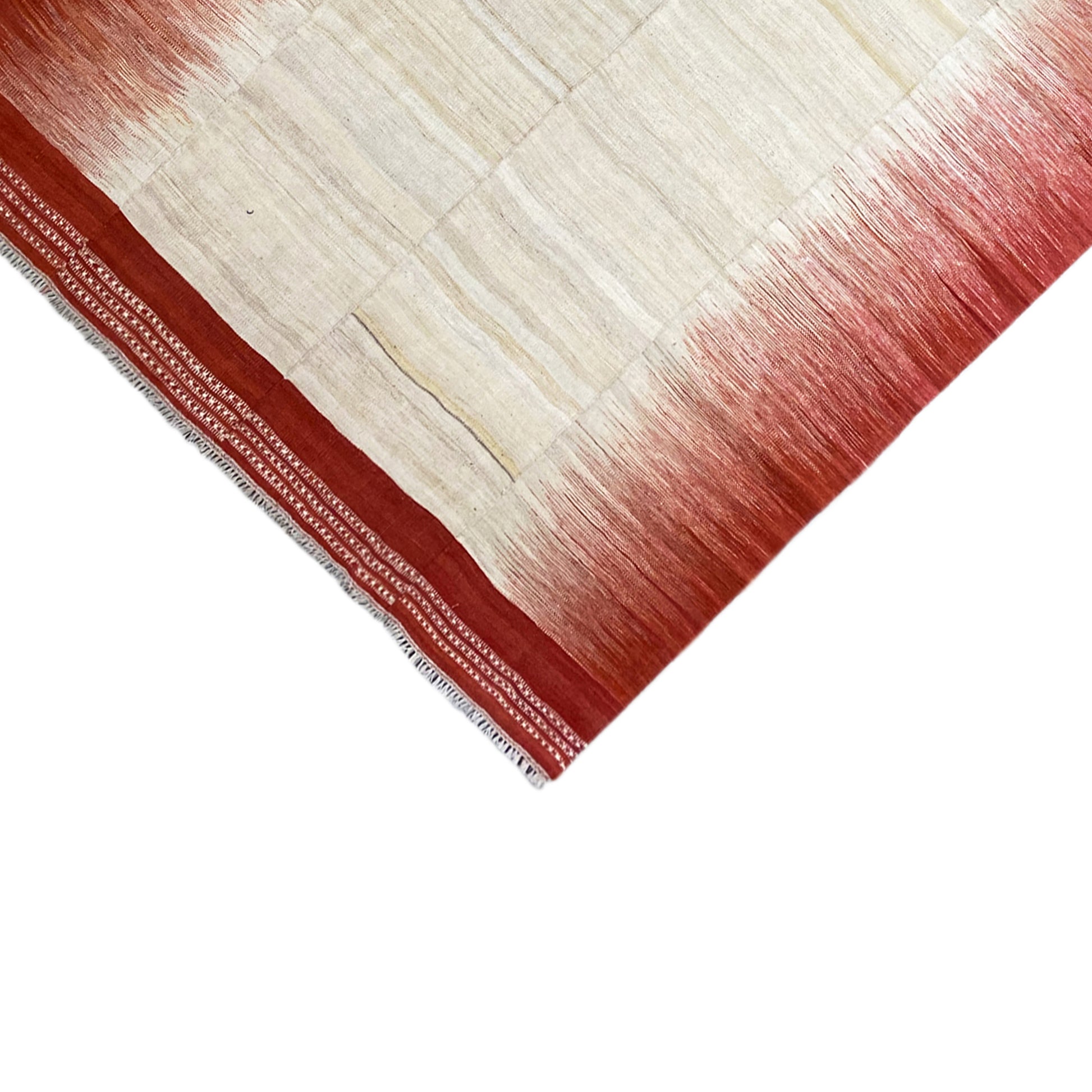 Give your room a vibrant touch with this modern flatwoven kelim measuring 307x203 cm. Made from high-quality wool with a cotton warp, this rug impresses with its durability and pleasant feel. The striking ombré pattern in warm red tones, gently transitioning into a neutral beige, makes it the ideal accent piece for modern or eclectic decor styles. It creates a dynamic yet inviting atmosphere that enriches any room.