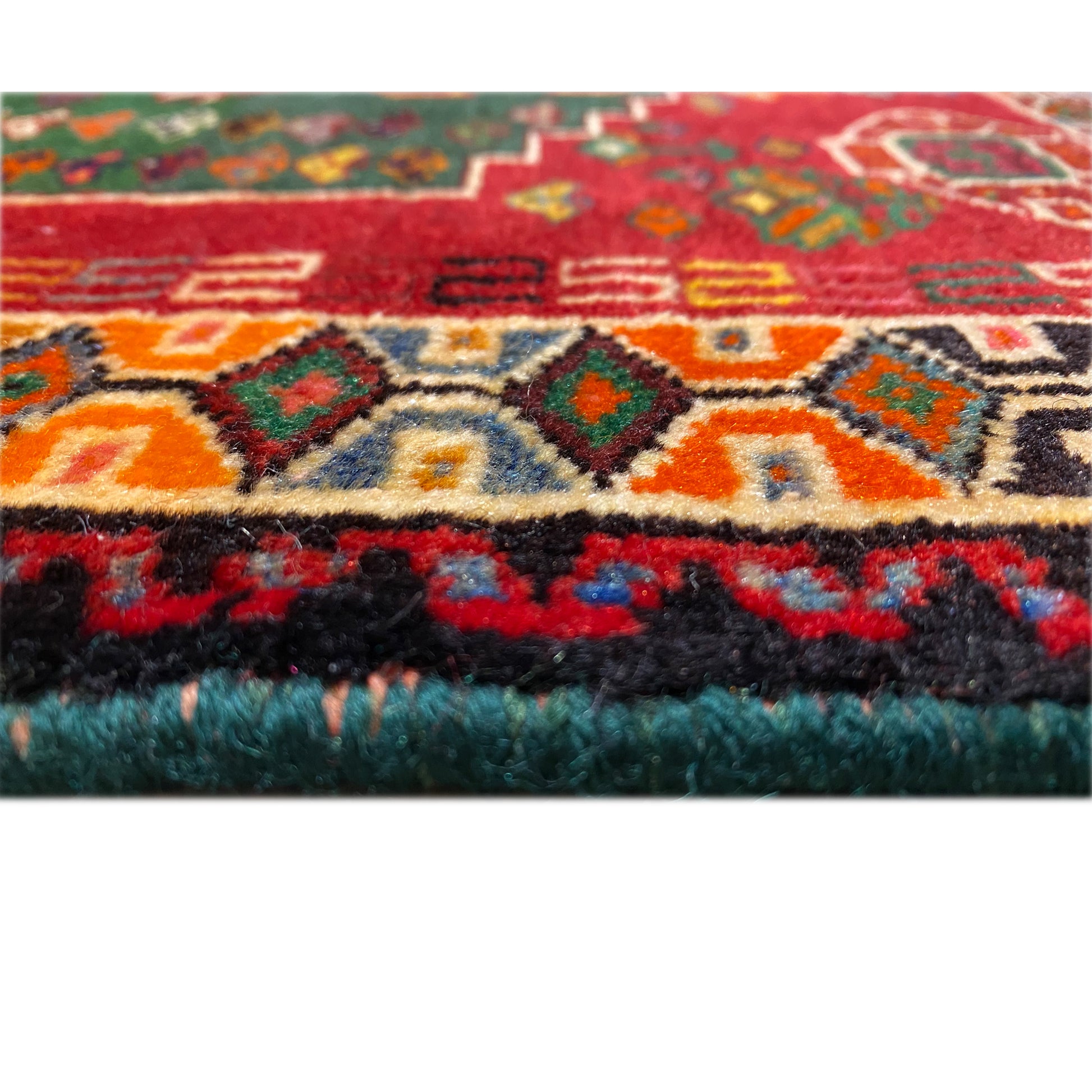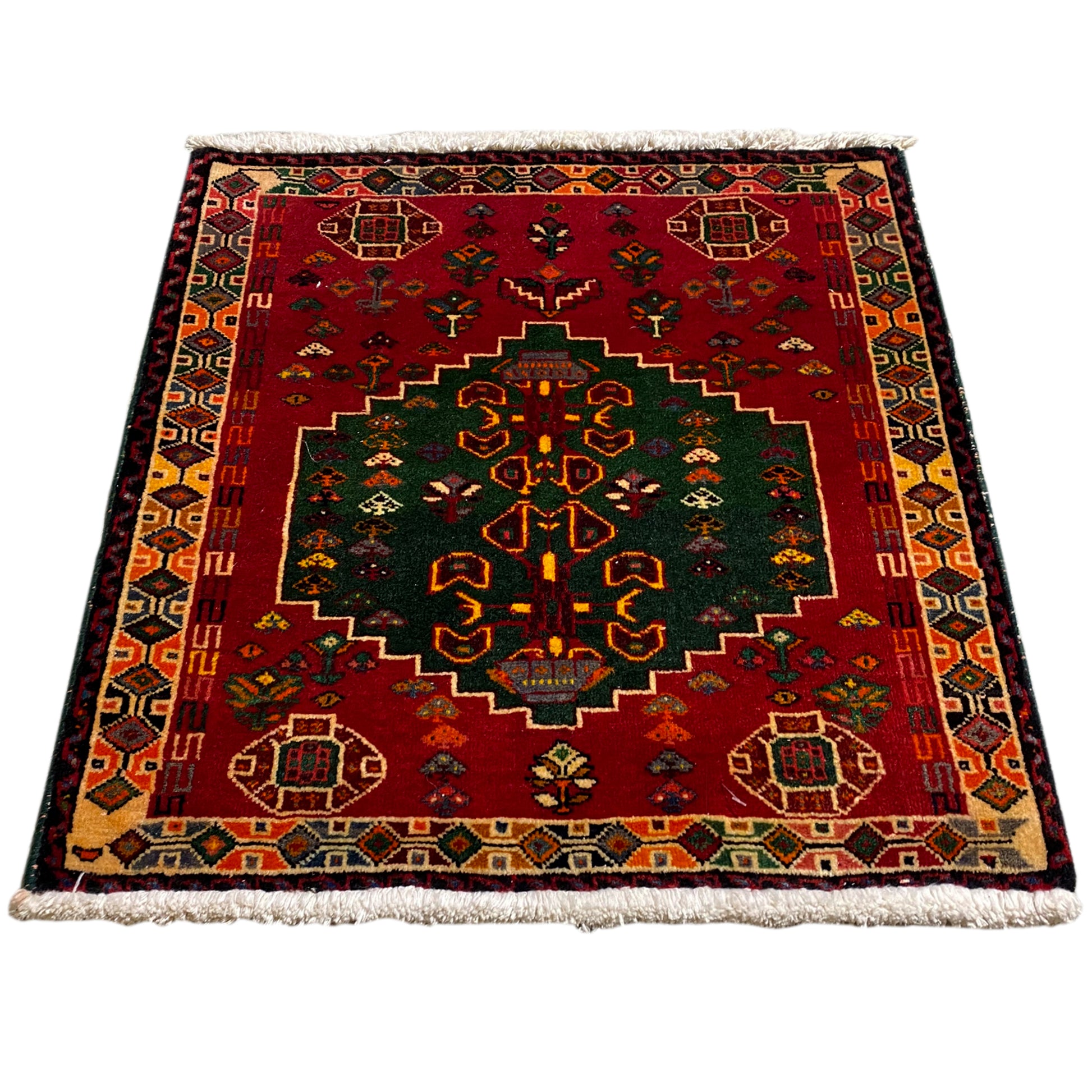This fascinating, hand-knotted Poshti rug in a vibrant red tone, accented by a striking green central medallion, is a testament to nomadic weaving art. These special "Torkey" rugs come from the "Tork" tribal group in southern Iran. Made from high-quality wool with a cotton warp and measuring 62x61 cm, this piece adds an authentic, traditional atmosphere to any room. Its unique geometric pattern, combined with robust craftsmanship, makes it a durable and aesthetically appealing highlight that unites culture and comfort.