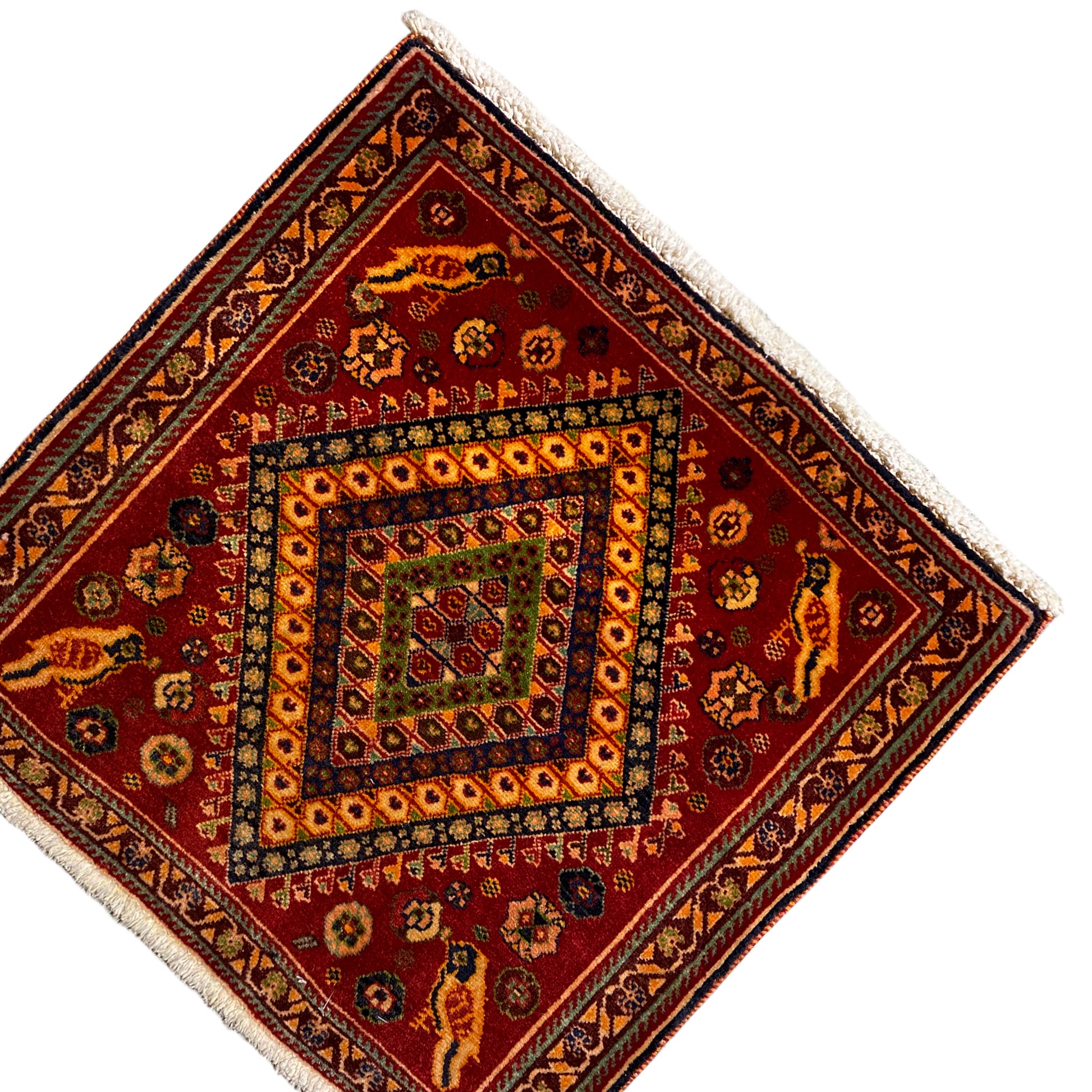 This exquisite, hand-knotted Poshti rug is an authentic testament to the nomadic weaving art of the southern Iranian "Tork" tribal group, known for their distinctive "Torkey" rugs. Made from the finest wool with a cotton warp, this square measuring 65x65 cm features a deep red as the base color. A striking, multicolored diamond medallion adorns the center, while stylized birds and floral motifs artistically enliven the field. This piece is ideal for adding traditional charm and a vibrant touch to any room, while telling stories of a rich cultural past.