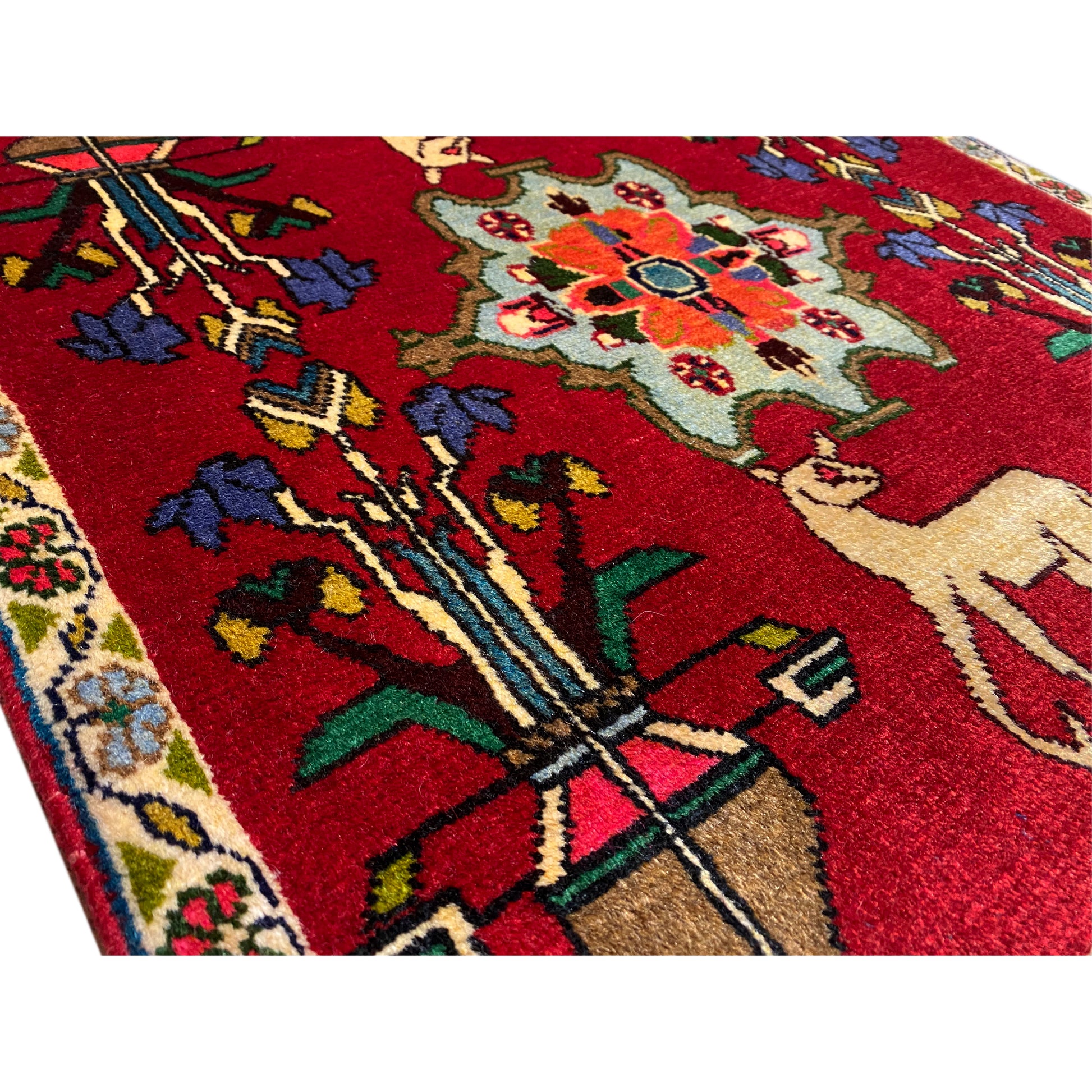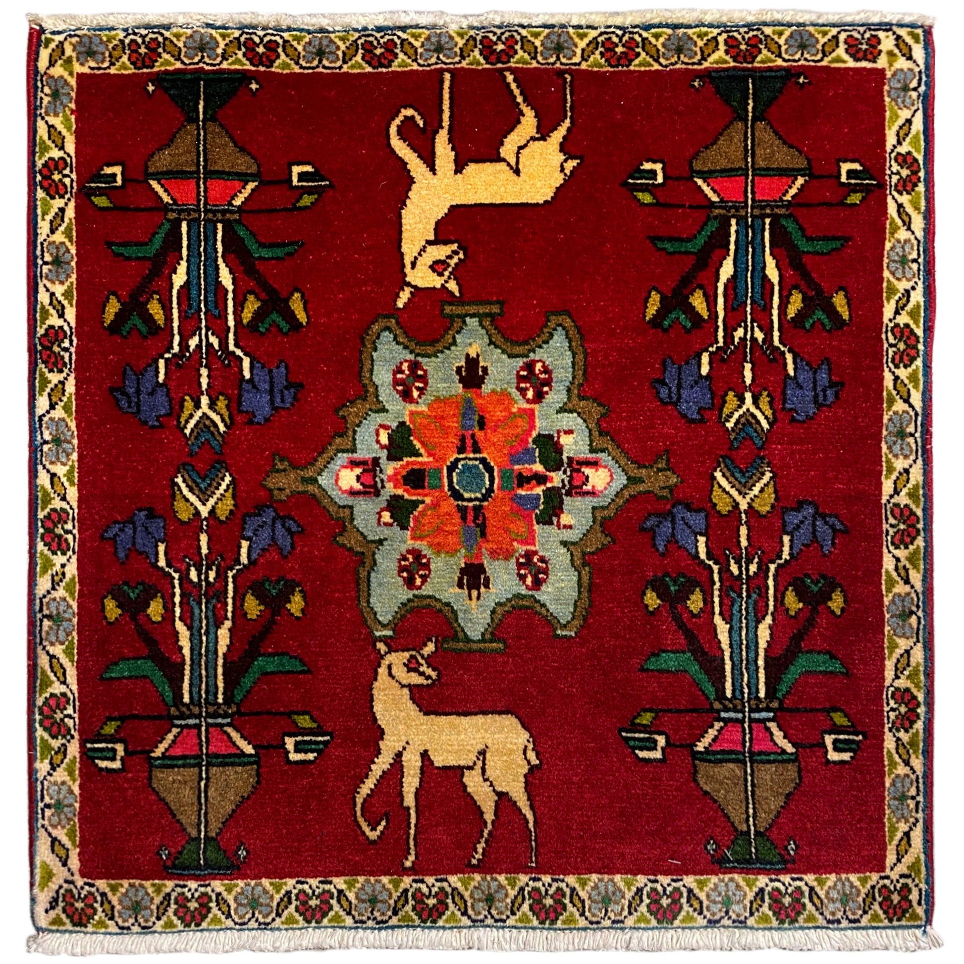 This exquisite, hand-knotted Poshti rug is a captivating piece of weaving art from southern Iran, crafted by the skilled "Tork" tribal group, whose creations are known as "Torkey" rugs. Measuring 67x64 cm, this piece made of wool and cotton features a vibrant red background that serves as a stage for a colorful central medallion and charming animal depictions. The stylized wild animal figures, nestled among abstract tree or flower elements, give this rug a narrative depth. Ideal for lovers of traditional decor, it brings cultural richness and a warm atmosphere to any room.