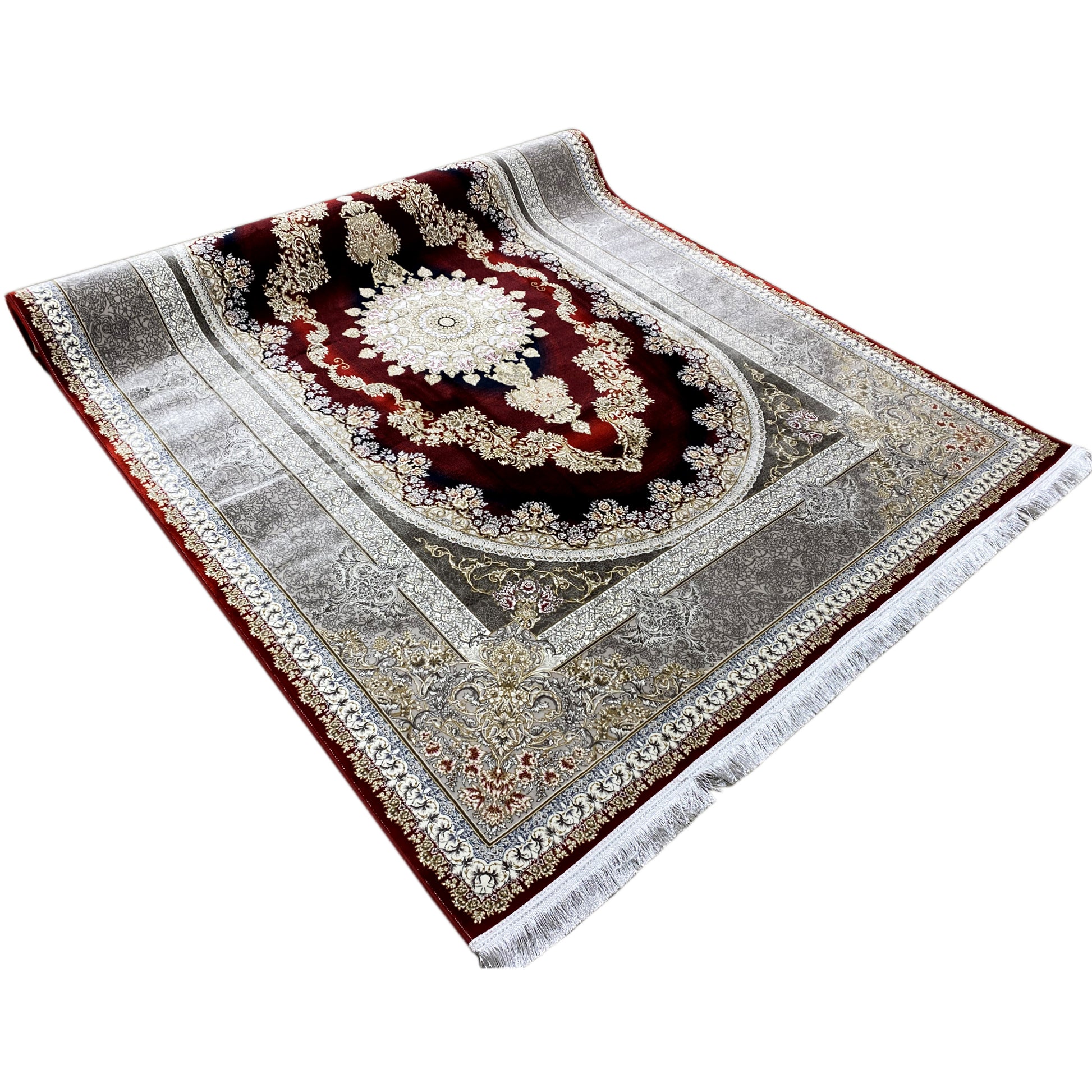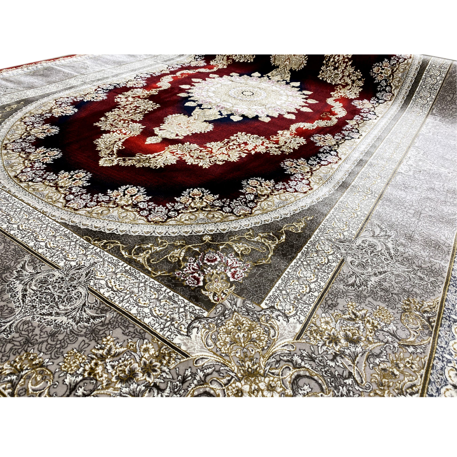 Add opulent elegance to your home with this beautiful classic rug. Its striking oval medallion design features an intricate pattern in deep red and gold tones, framed by a refined silver border. Made from 100% heat-treated acrylic, this soft and durable rug is ideal for high-traffic areas, combining luxurious style with modern resilience. The generous size of 170x240cm makes it the perfect statement piece for your living or dining room.