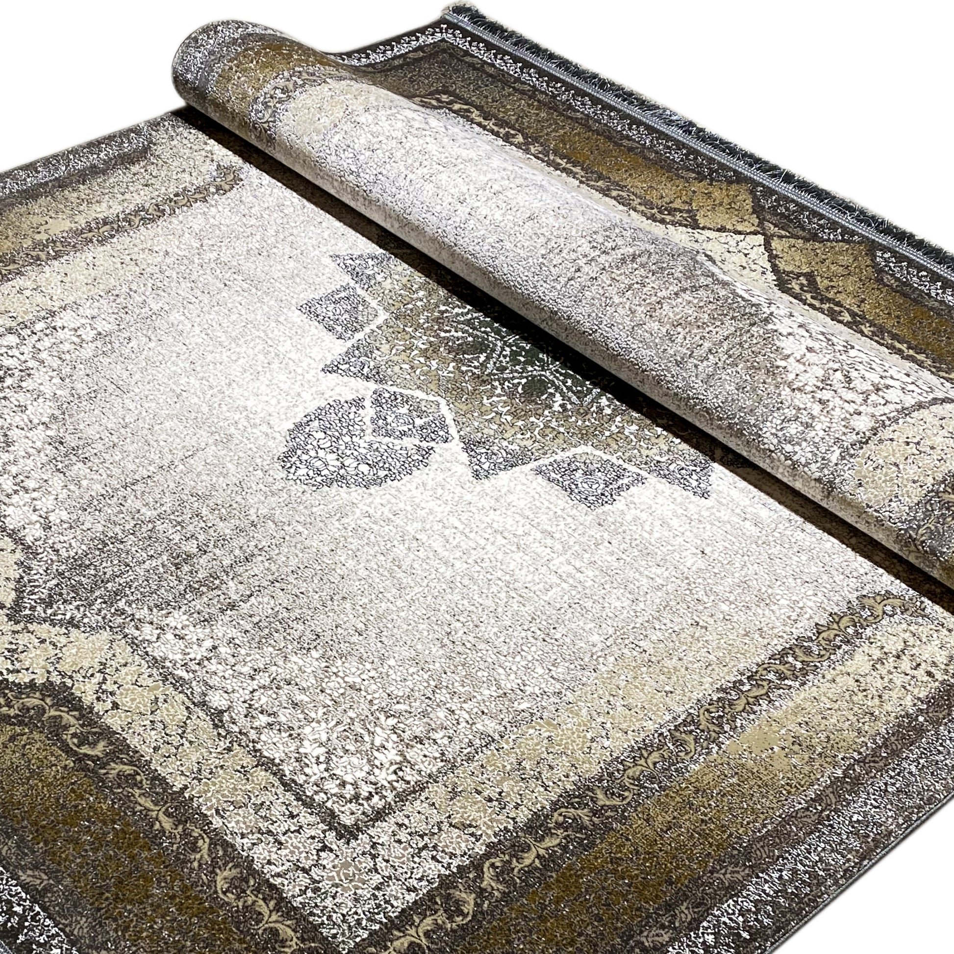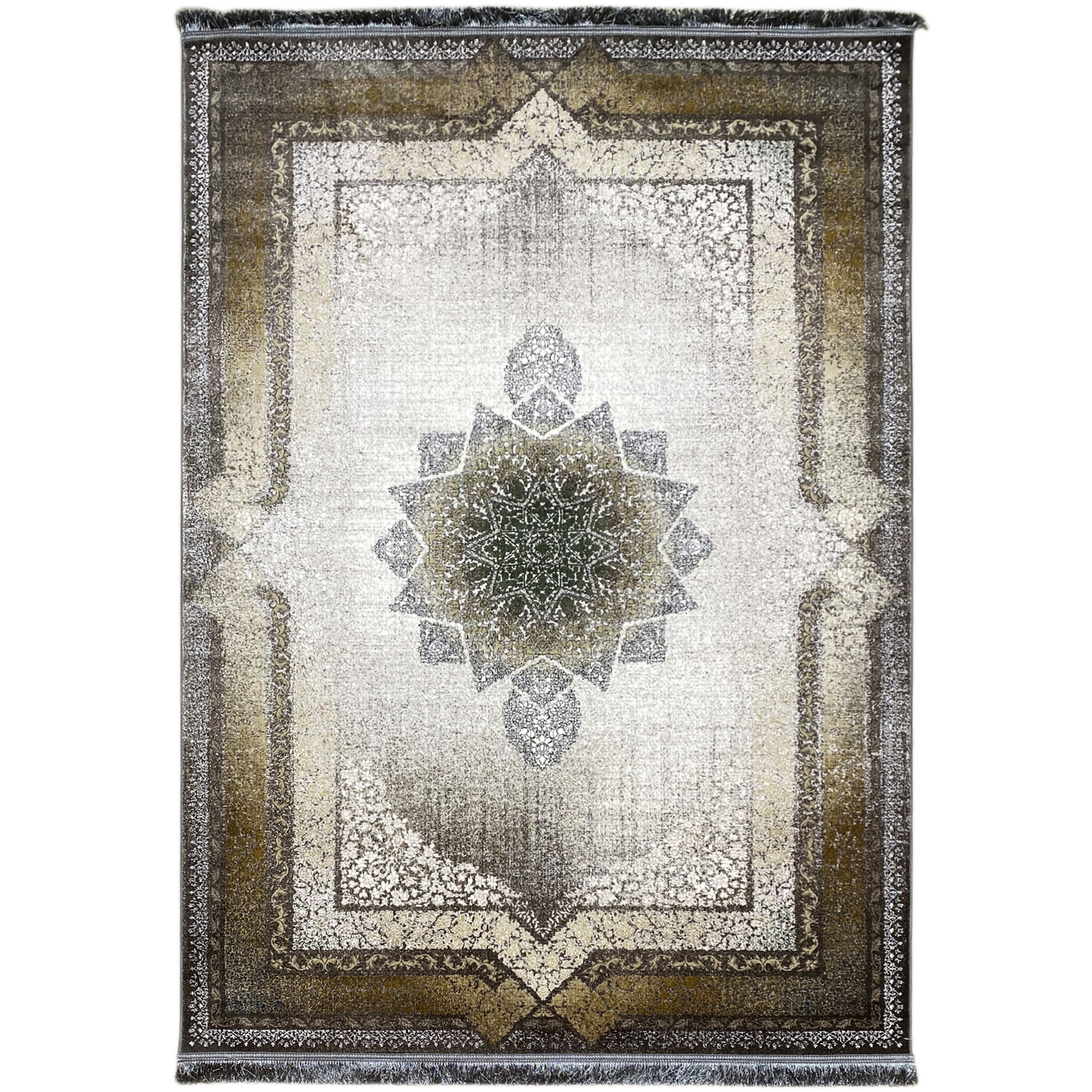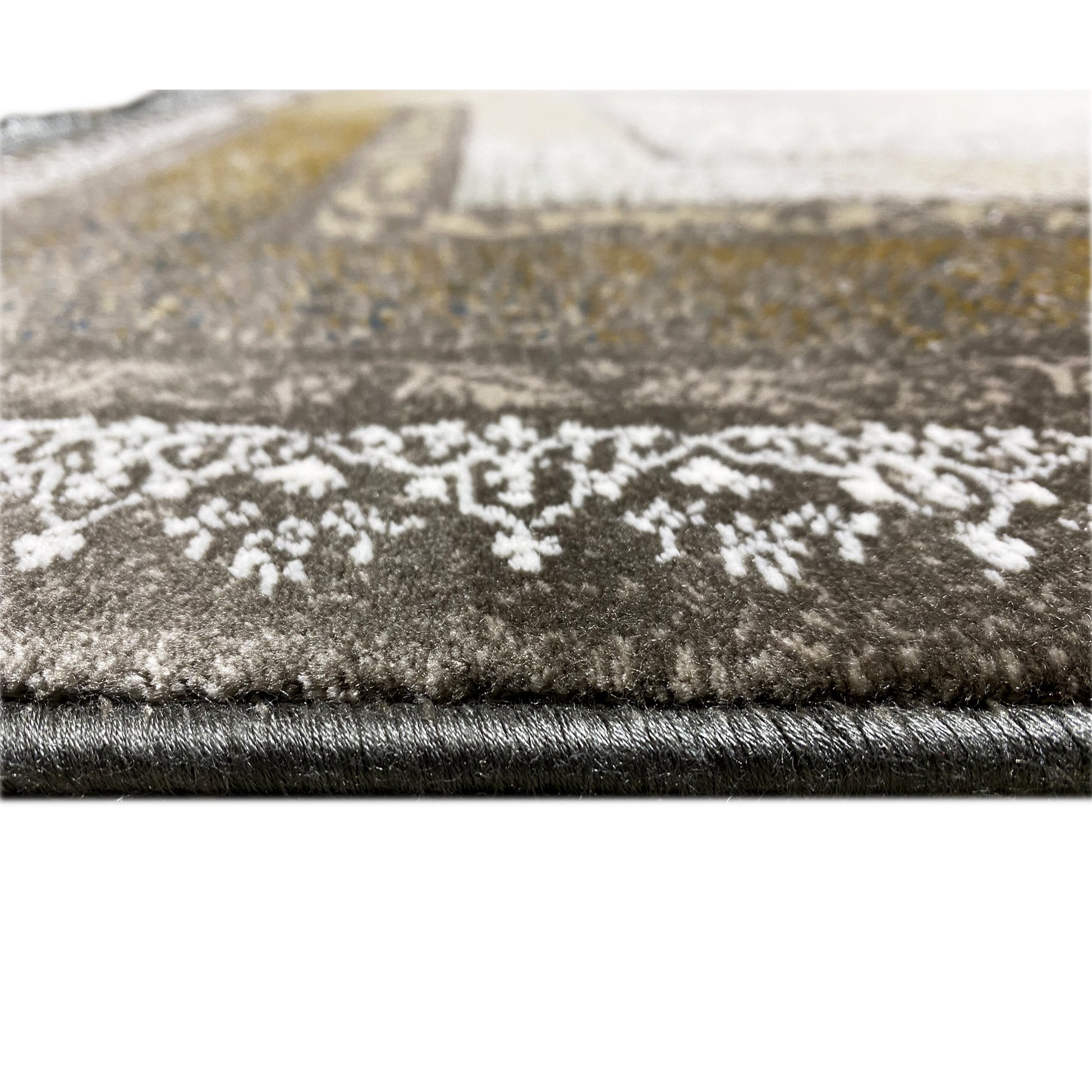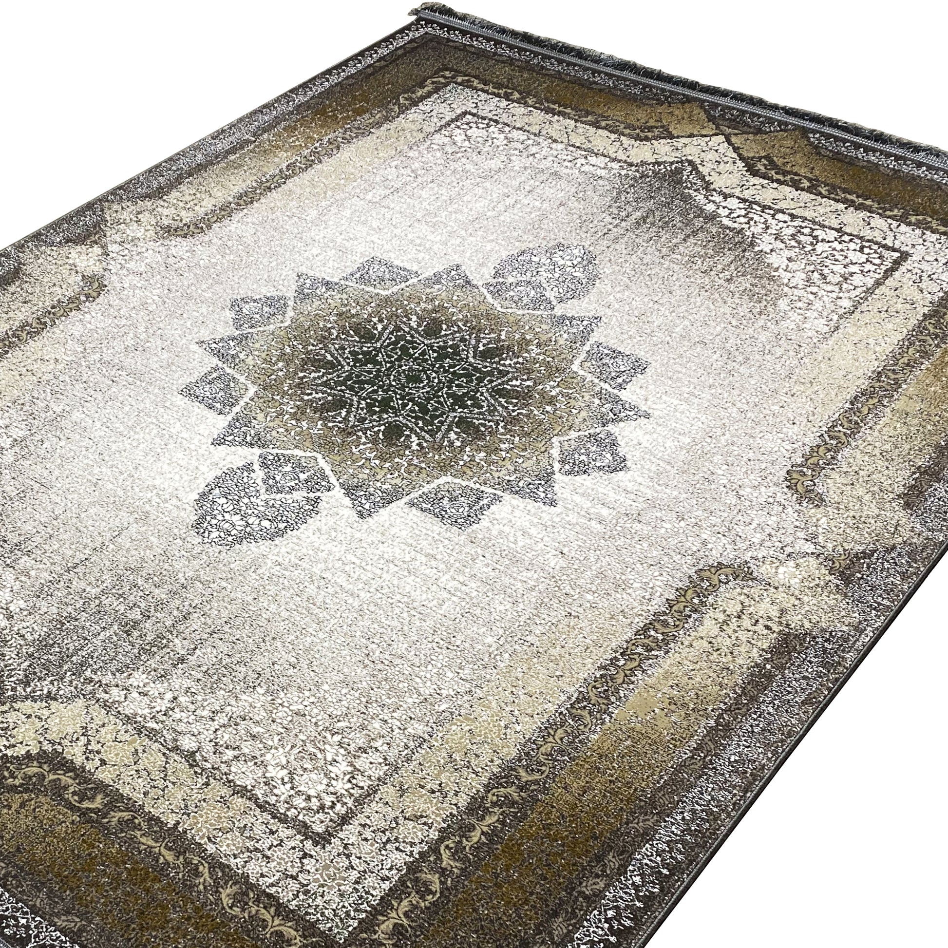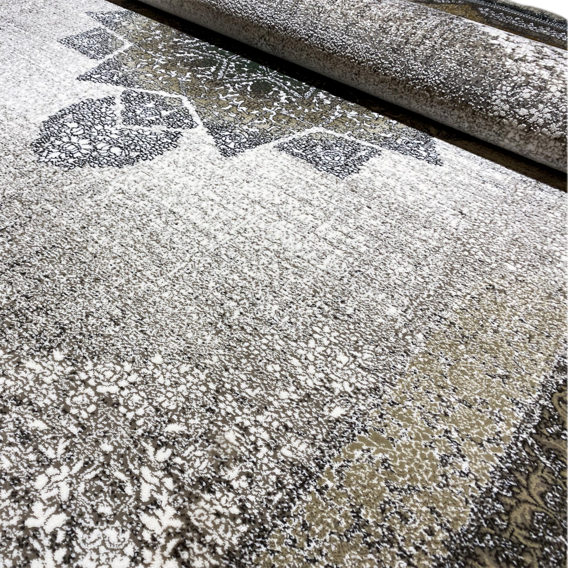 Add a touch of timeless elegance to your home with this beautiful modern classic rug. The striking geometric star pattern in the center creates an impressive focal point, surrounded by a traditionally decorated border. The smoky gray and beige tones, along with the distressed look, give it a timeless appeal. Made from 100% heat-treated acrylic, this soft and durable rug is ideal for high-traffic areas. The generous size of 170x240cm makes it the perfect statement piece for your living or bedroom.