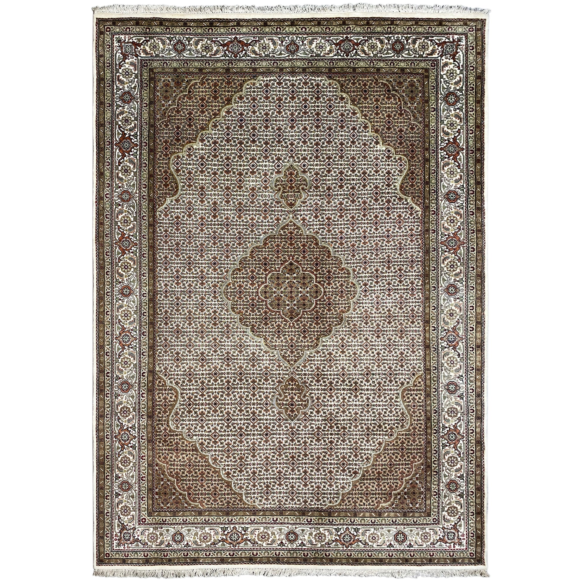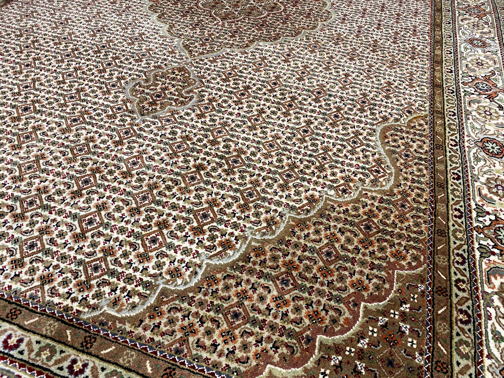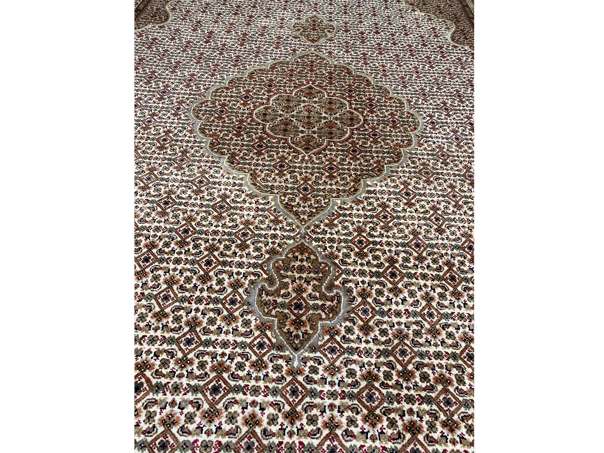 Originally, the Tabriz Mahi comes from Persia. Nowadays, these carpets are also hand-knotted in India with the same quality standards. Our Mahi are high-quality, noble carpets woven from fine wool. The carpets have strong, clear, and deep colors and are very durable due to their good workmanship.